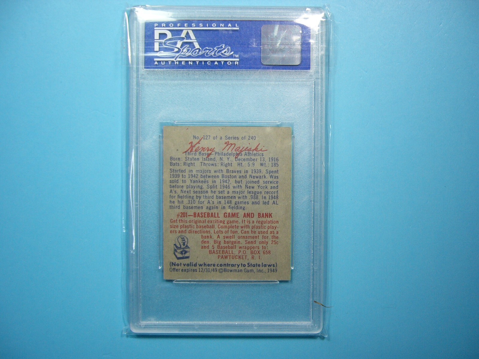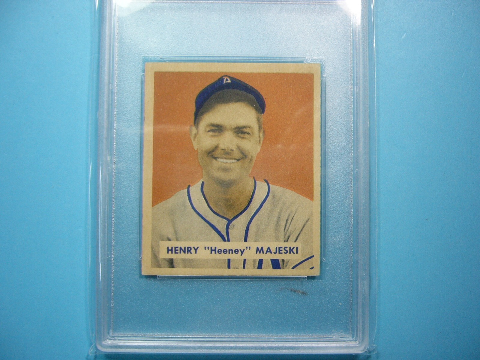 YOU ARE BIDDING ON A 1949 BOWMAN MLB BASEBALL CARD #127 HANK MAJESKI, ROOKIE CARD, PHILADELPIA ATHLETICS. SCRIPT PLAYER NAME ON BACK SIDE VARIATION. CARD IS GRADED 8 BY PSA IN NEAR MINT/MINT CONDITION. SEE SCANS FOR FURTHER CONDITION. GREAT COLOUR--A VERY SHARP, CLEAN & ATTRACTIVE CARD FROM THIS VINTAGE BOWMAN BASEBALL CARD SET!!! THANKS FOR LOOKING AND GOOD LUCK!!! ------------------------------------------------------------------------------------------------------------------------------------------- SHIPPING WITHIN CANADA WITH TRACKING & INSURANCE IS $12.50, TO THE UNITED STATES $15.00, AND INTERNATIONALLY $55.00 (EVERYWHERE ELSE). ITEM WILL BE CAREFULLY PACKAGED SO AS NOT TO GET DAMAGED DURING SHIPPING. WE DO COMBINE SHIPPING ON MULTIPLE PURCHASES--ONLY 50 CENTS MORE PER ADDITIONAL GRADED CARD OR 20 CENTS MORE PER ADDITIONAL SINGLE UNGRADED PHOTO OR CARD. TAKE A LOOK AT OUR OTHER AUCTIONS AND SAVE ON SHIPPING!!!