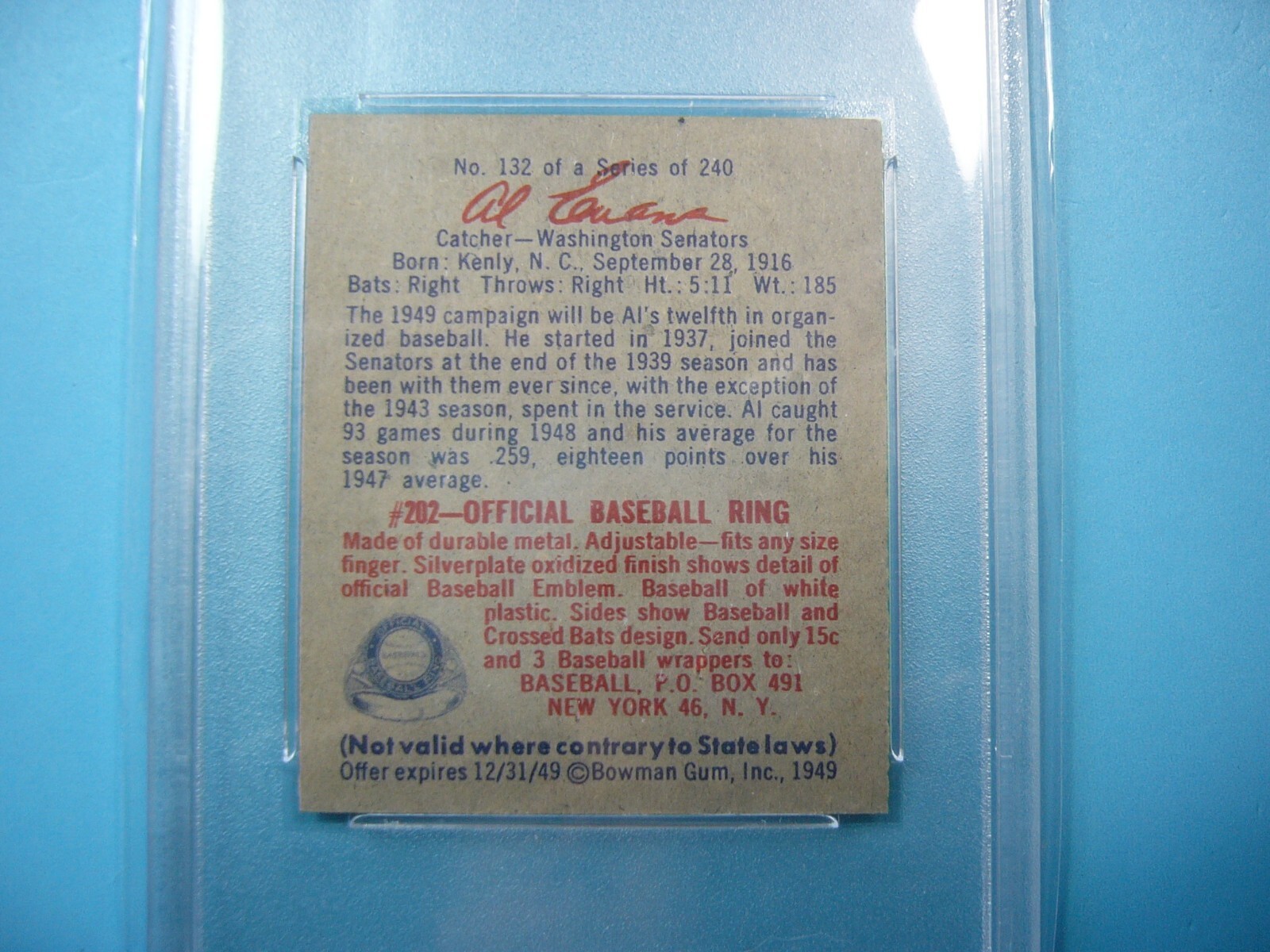 YOU ARE BIDDING ON A 1949 BOWMAN MLB BASEBALL CARD #132 AL EVANS, WASHINGTON SENATORS. SCRIPTED NAME ON BACK OF CARD. CARD IS GRADED 8 BY PSA IN NEAR MINT/MINT CONDITION. SEE SCANS FOR FURTHER CONDITION. GREAT COLOUR--A VERY SHARP, CLEAN & ATTRACTIVE CARD FROM THIS VINTAGE BOWMAN BASEBALL CARD SET!!! THANKS FOR LOOKING AND GOOD LUCK!!! ------------------------------------------------------------------------------------------------------------------------------------------- SHIPPING WITHIN CANADA WITH TRACKING & INSURANCE IS $12.50, TO THE UNITED STATES $15.00, AND INTERNATIONALLY $55.00 (EVERYWHERE ELSE). ITEM WILL BE CAREFULLY PACKAGED SO AS NOT TO GET DAMAGED DURING SHIPPING. WE DO COMBINE SHIPPING ON MULTIPLE PURCHASES--ONLY 50 CENTS MORE PER ADDITIONAL GRADED CARD OR 20 CENTS MORE PER ADDITIONAL SINGLE UNGRADED PHOTO OR CARD. TAKE A LOOK AT OUR OTHER AUCTIONS AND SAVE ON SHIPPING!!!