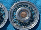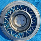 PAIR OF 15" WIRE SPOKE HUBCUPS. SOLID USED CONDITION. MISSING ONE OF THE BACKSIDE MOUNTING PLATES. THE INCLUDED PLATE COULD BE USED AS A TEMPLATE FOR FABRICATING ANOTHER. NICE CORES FOR RESTORATION. USE CLOSEUP VIEWER TO BEST DETERMINE CONDITION