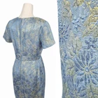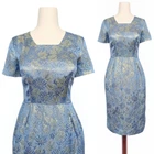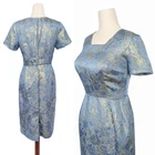✦FOR SALE: 1950s Brocade Cocktail Dress. This stunning slate blue and gold jacquard 50s vintage hourglass wiggle dress features a square neckline with a darted bust, short sleeves, and a cinched waist that leads into a straight skirt. The material is very shimmery and catches the light beautifully. I believe it's a silk blend. Zips up the back with a metal zipper and fastens with a hook at the waist and neck. The interior skirt is lined. By Lady Petite, Union Made. Fits a modern Small, shown clipped to fit XS mannequin. No stretch! 36-37” Bust, 28” Waist, 39” Hips. • ✿ Measurements lying flat in inches: • •Shoulders: 15 •Bust: 18-18.5 •Waist: 14 •Hips: 19 •Length: 41 •Sleeves: 7.5