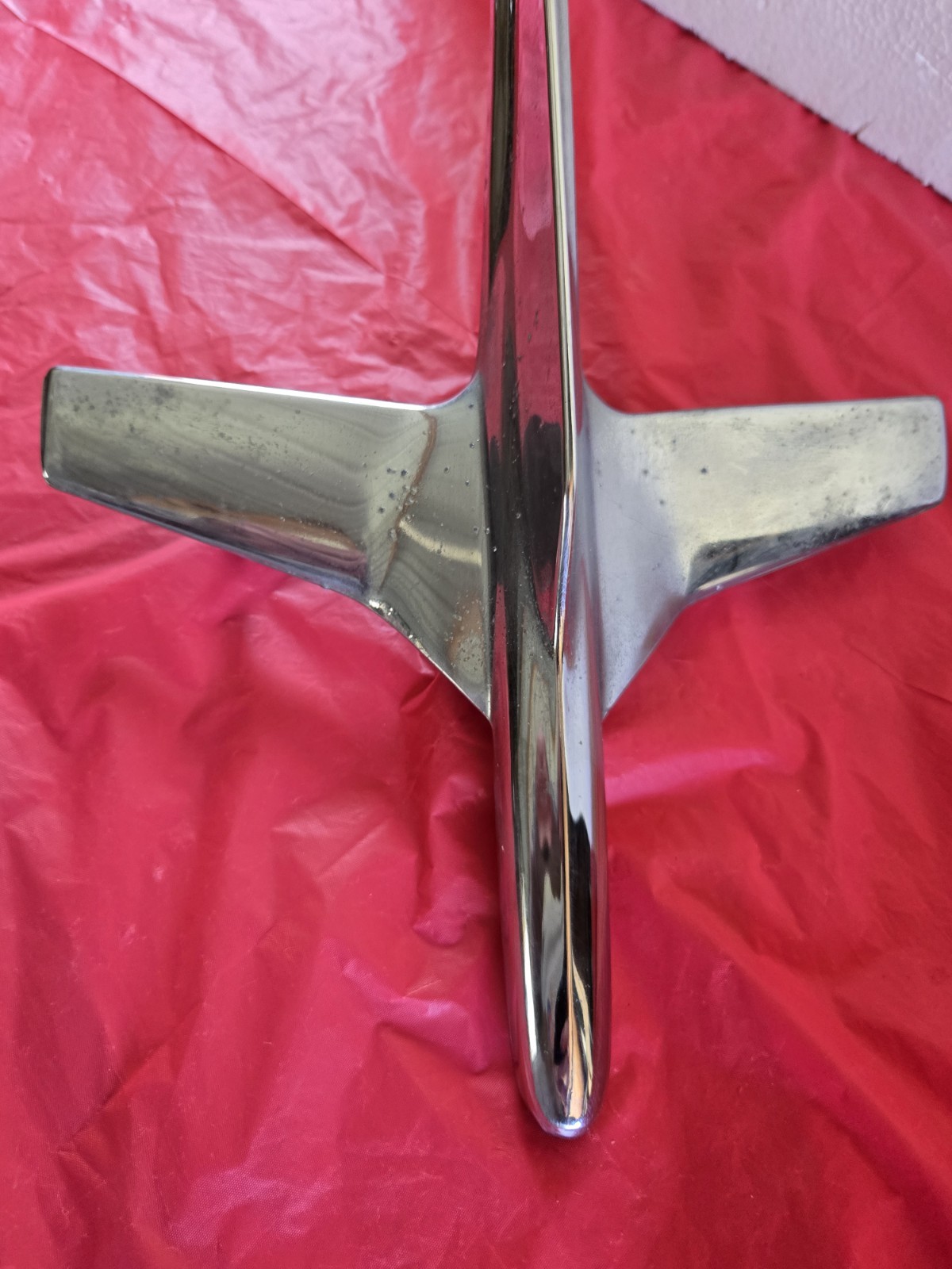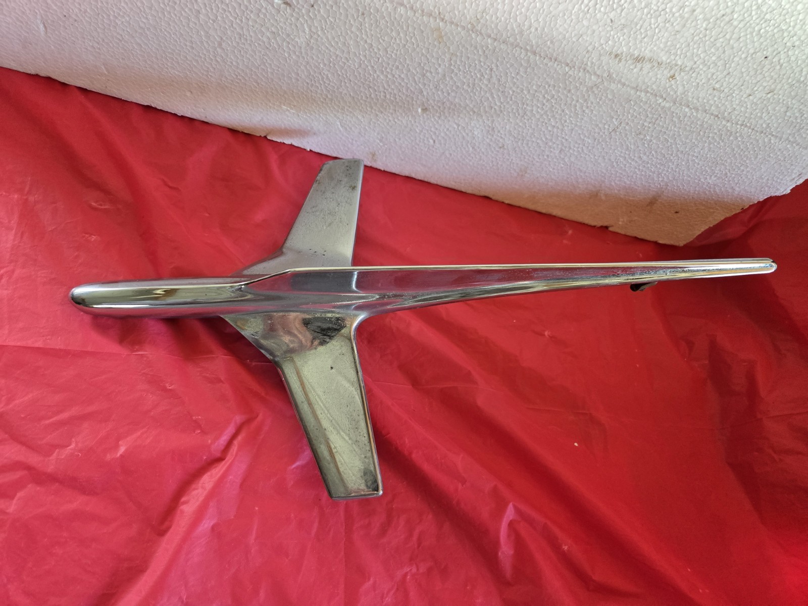 The 1950s Ford Hood Ornament Rocket Plane is a vintage part suitable for cars, featuring a chrome finish and metal construction. Manufactured by Ford with the part number BN16850-A, this hood ornament is designed to be placed on the front of a vehicle, showcasing a "V" emblem theme. Made in the United States, this unique ornament adds a touch of nostalgia and style to any classic Ford car, making it a desirable collector's item for those passionate about automotive accessories. All mounting post are intact.