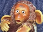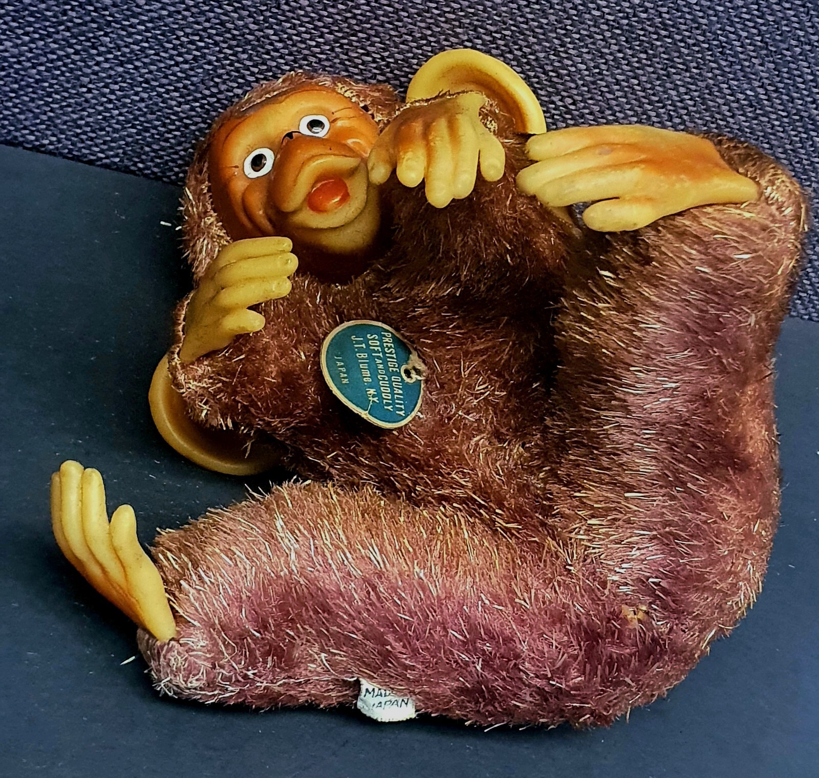 This Chimp doll is approx 6.5 in tall (sitting) with a rubber face and ears, and rubber hands/feet (its feet are literally hands). It is stuffed with a straw-like material, with a covering of some type of coarse material (not soft to the touch). The stitchings are in a somewhat delicate state and appear to have loosened slightly. It has a sewn-in “Made In Japan” cloth tag, as well as a paper tag with the name of the import company, “J.T. Blume”. This item is most likely from the 1950s.