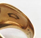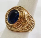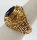 GOLD MEN’S 10 KARAT GOLD SCHOOL RING GRADUATING CLASS OF 1953 PEEKSKILL MILITARY ACADEMY ESTATE OF EDWARD JAMES MARKO , ESQ . PROMINENT FT. LAUDERDALE LAWYER THIS 10 KARAT GOLD CLASS RING IS WITH A FACETED BLUE SYNTHETIC STONE INSET INTO THE CROWN (CHIPPING FROM WEAR); ONE SHANK BEARS THE AMERICAN EAGLE CLUTCHING SHIELD WITH THE YEAR 1953; THE OTHER SHANK BEARS THE ARMS OF PEEKSKILL MILITARY ACADEMY; THE CROWN IS ENCIRCLED BY THE SCHOOL NAME AND THE YEAR OF IT’S FOUNDING; INSIDE IS INSCRIBED THE NAME OF THE GRADUATE, EDWARD MARKO. THIS CLASS RING BELONGED TO: EDWARD JAMES MARKO, ESQ. (B. FLUSHING, NY IN 1934 – D. FT. LAUDERDALE, FL IN 2017), MARKO WAS A PROMINENT LONG-TIME FORT LAUDERDALE ATTORNEY AND GENERAL COUNSEL FOR THE BROWARD COUNTY SCHOOL BOARD FOR 42 YEARS, MARKO GRADUATED PEEKSKILL MILITARY ACADEMY 1953, UNIVERSITY OF MIAMI 1957, AND MIAMI SCHOOL OF LAW 1962. THROUGHOUT HIS LONG LEGAL CAREER HE RECEIVED COUNTLESS AWARDS AND HONORS. THE RING IS FROM THE GRADUATING CLASS OF 1953 OF THE PEEKSKILL MILITARY ACADEMY . PEEKSKILL WAS A MILITARY ACADEMY FOR YOUNG MEN AND WOMEN, FOUNDED IN 1833 AND WAS LOCATED IN PEEKSKILL, NEW YORK. THE ACADEMY WAS BUILT BY A HANGING TREE WHERE A BRITISH SPY WAS EXECUTED IN 1777. DURING THE 1960S, THE NEW YORK JETS FOOTBALL TEAM USED THE ACADEMY AND ITS PLAYING FIELD AS A SUMMER TRAINING CAMP. AMONG ITS NOTABLE GRADUATES WAS FRANK L. BAUM, AUTHOR OF THE WIZARD OF OZ , AND ACTOR LEE MARVIN. WEIGHS 12.5 GRAMS 1OK GOLD SIZE 7 1/2
