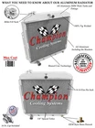 Champion Cooling radiators are tig welded with aircraft grade aluminum. Every radiator comes with a limited lifetime warranty so you can buy with confidence! Product Specifications: Core (H x W): 20" x 23" - Overall (H x W): 26.25" x 26.75" - Hose Locations (In x Out): Center x Driver - Hose Fittings (In x Out): 1.5" x 1.75" - TOC: 1/8-27NPTPlease click on the "Read more" link below to view a complete item description with product videos and additional items to upgrade your cooling system. PART INFORMATION Shipping Payment Policies Contact Us Part Information Related Items Genuine Champion Cooling Systems Part #MC5356 This radiator is designed for either a V6 or a V8 engine but does NOT work on a flathead engine. (Please Verify Your Radiator Core size Before You Buy) Features Higher density core: cooling rows are spaced 3/8" apart: giving you 25% more rows within the core than other aluminum radiators sold on eBay and 35% more rows than OEM copper. Aluminum dissipates heat more efficiently than copper or brass. 14-16 cooling fins per inch (42 per square inch) giving you approximately 1500 more cooling fins than other aluminum radiators and approximately 3000 more than OEM copper radiators. Lighter weight. Outperforms other 2, 3 and 4 row copper radiators. High performance appearance. You get "BIG BLOCK COOLING" and "PEACE OF MIND" when you drive your car with a Champion Cooling Systems radiator. You could easily spend $400 - $1,000 more for a radiator of similar quality. Specifications Down Flow Or Cross Flow Type: Down Flow Mounting Type: Bracket Tank Material: Aluminum Core Material: Aluminum Overall Height: 26 1/4 Overall Width: 26 3/4 Core Height: 20 Core Width: 23 Inlet Location: Center Inlet Diameter: 1 1/2 Outlet Location: Driver Outlet Diameter: 1 3/4 Core Row Quantity: 4 Row Transmission Oil Cooler Fitting Type: 1/8-27NPT Internal Transmission Oil Cooler: Yes Filler Neck Attached: Yes Core Thickness: 2 3/4 Core Tube Width: 0.56 This package includes a 4 Row All Aluminum Radiator. Champion Cooling Systems radiators are manufactured at their ISO certified facility. They are made to high standards of quality and workmanship using the Highest Grades of aluminum available and are constructed with 100% welded seams, brazed core technology and no epoxy. They come with a Lifetime Limited Warranty and are made to install with little or no modifications using your Original Mounts giving you the confidence you desire. Shipping Shipping Shipping Policy FedEx Ground Service to the Lower (48) States: FREE SHIPPING. (Hawaii and Alaska $95.00 Additional Shipping Charge). International Shipments are via FedEx International (See Shipping Drop Box For Prices). Payment Guarantee Policies Contact Us Thank You!