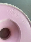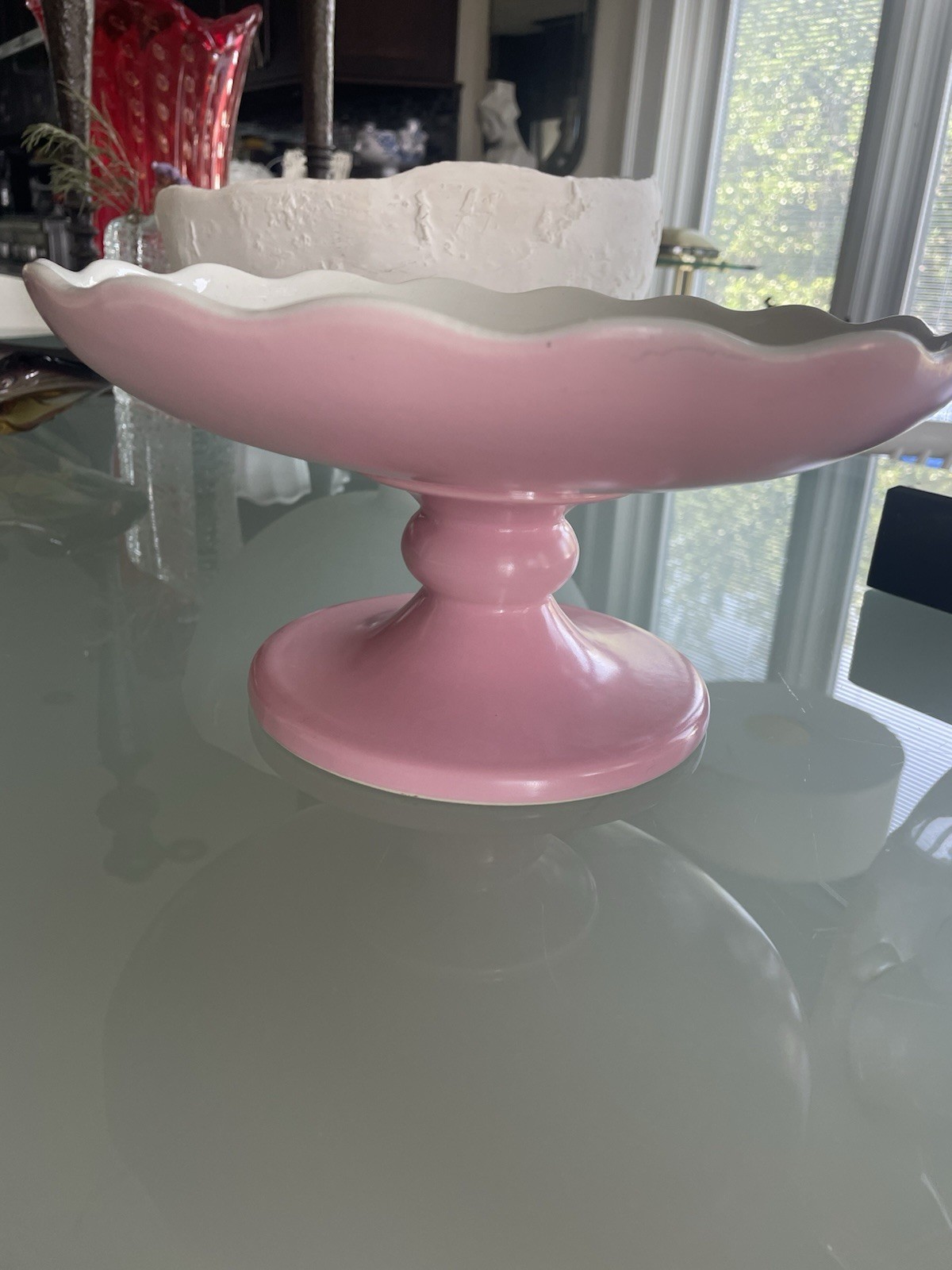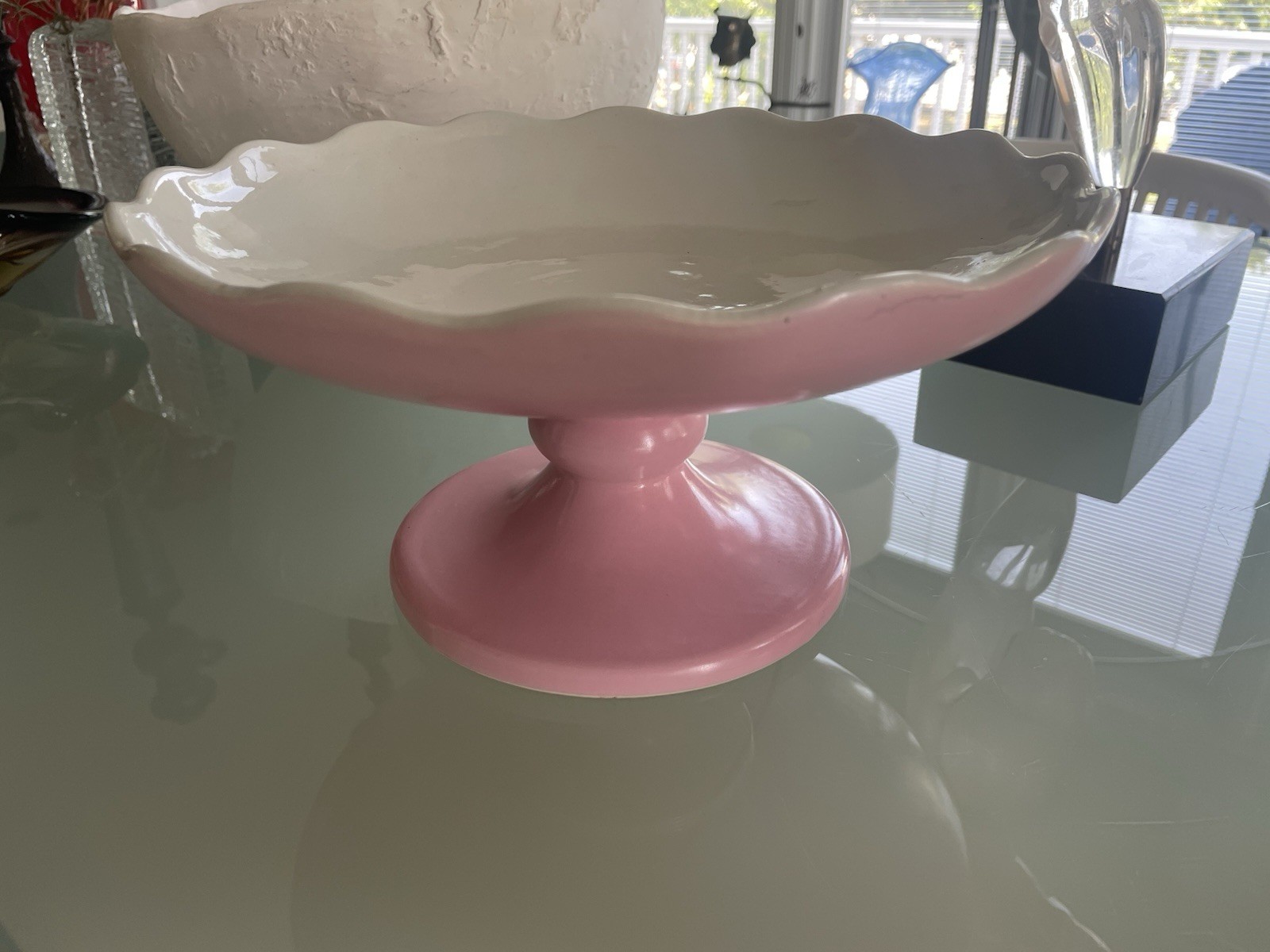 1956 Pink Hull USA pottery footed pedestal cake stand is a vintage piece of mid-century modern pottery. It is 10.5" in diameter and stands at 5" tall. The Hull brand and production style of art pottery add to its collectible charm, perfect for all occasions and easy to clean. This piece is in excellent condition with no chips, cracks or repairs.