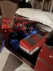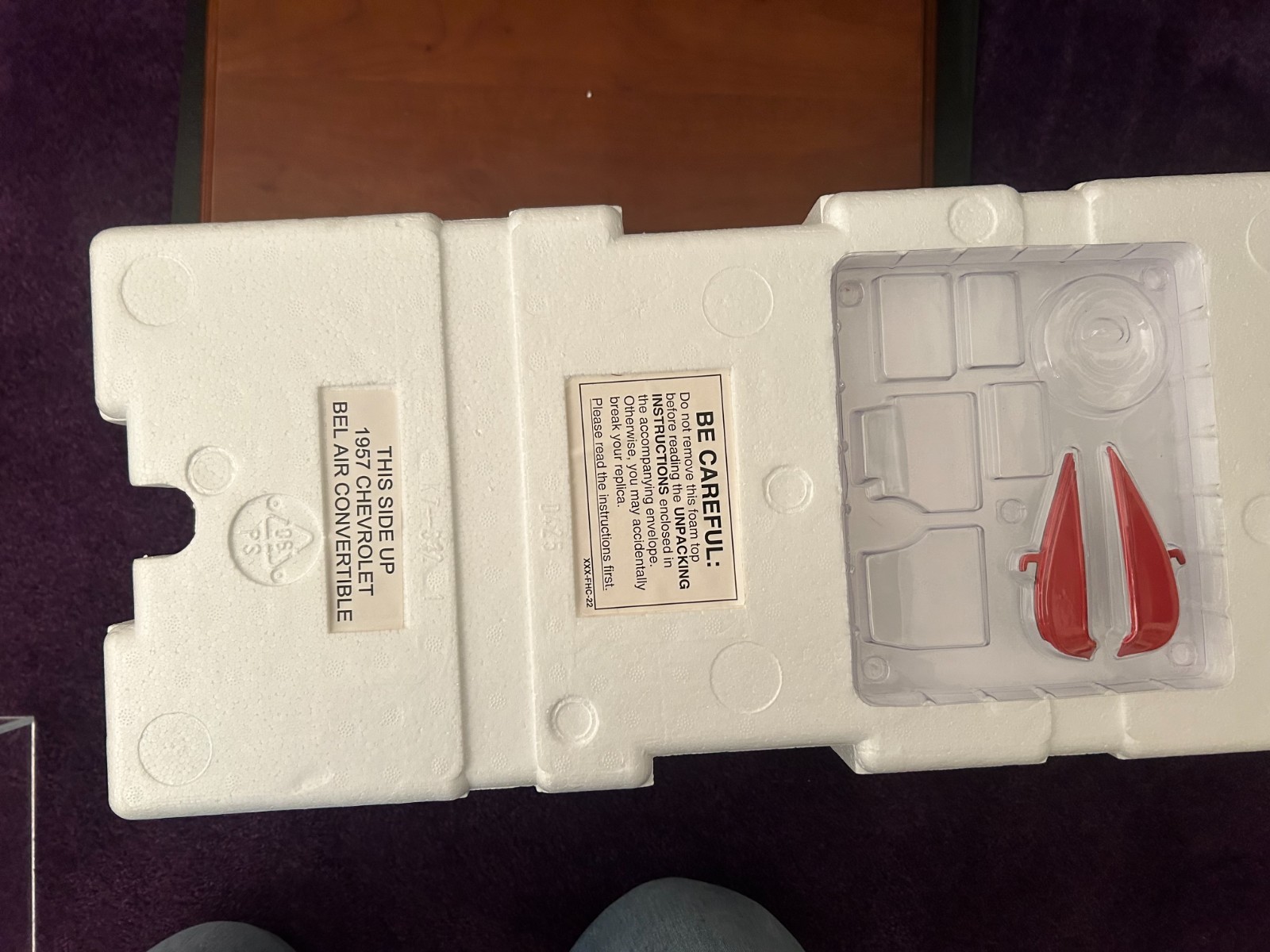 Danbury Mint 1957 Chevrolet Bel Air Convertible – Red/White Top – 1:12 – With Display Case From my father’s meticulous diecast collection collected over 30 years. This ’57 Bel Air Convertible is a beautiful Danbury Mint example in Matador-red with a white convertible top and wide whitewall tires, presented on the original wood base with nameplate , protected by a crystal-clear acrylic display case . It has been kept in a sealed display environment since purchase in a smoke- and pet-free home. Highlights & Features Authentic Danbury Mint 1:12 scale precision die-cast Iconic ’57 Chevy Bel Air fins with correct chrome spear & scripts Detailed interior (two-tone seats, dash, steering wheel) Realistic engine bay and undercarriage detailing Opening panels and rolling wheels (as typical for Danbury Mint) Includes wood base + metal plaque (“The 1957 Chevrolet Bel Air Convertible”) Includes acrylic dust cover/case that fits the base perfectly Condition Model: Near-mint from display only. Glossy paint, bright chrome, intact trim and badges. No breaks or repairs observed. Display case: Clear and presents beautifully; minor surface swirls from normal handling may be visible under bright light. Please review all photos carefully— the car you see is the exact one you’ll receive. Provenance Part of my dad’s carefully curated collection , stored and displayed in a protective case since purchase. He was the original owner and kept his models pristine. What’s Included Danbury Mint 1957 Chevy Bel Air Convertible (1:12) Wood display base with nameplate Fitted display case Shipping & Handling Professionally packed with care: model secured, case wrapped, and box double-walled. Ships insured with tracking. Notes The car is an absolute mint condition. I stand behind careful packaging and accurate representation. A standout, display-ready ’57 Bel Air from a serious collection—perfect for Danbury Mint, Chevrolet, and classic-car enthusiasts. Add this icon to your shelf today.