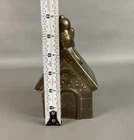 The product is a 1958 Vintage Leonard Metal Peanuts Snoopy On Dog House Coin Bank made of silver plate. This collectible item features the character Snoopy from the Peanuts franchise, specifically from the TV show "Snoopy with Charlie Brown." The coin bank is silver in color, measures 6" in height and 3.75" in length, and is a unique and nostalgic piece of animation merchandise from the United States.