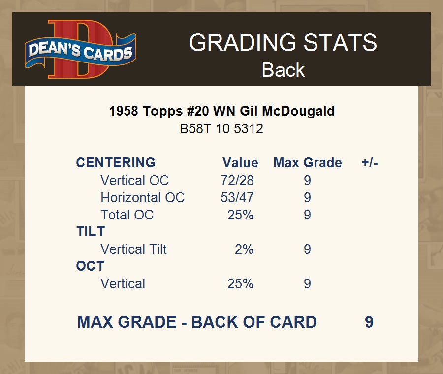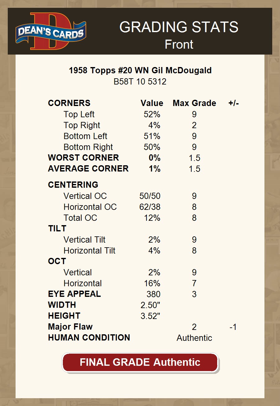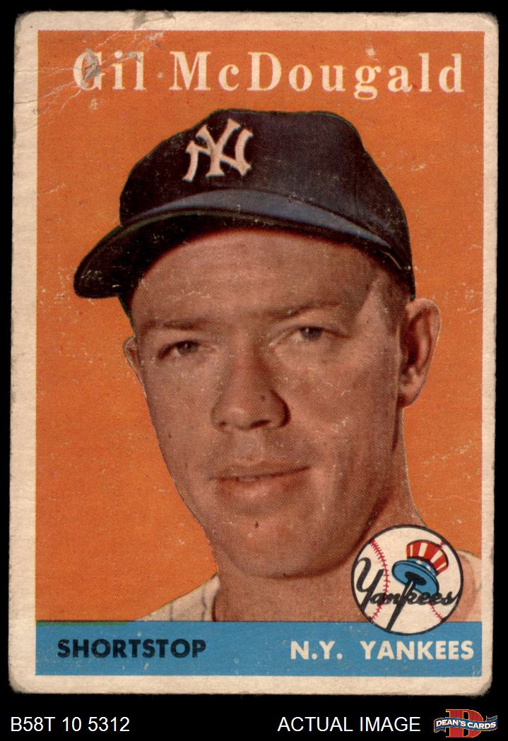1958 Topps #20 Gil McDougald White Name Yankees COMMON VARIATION AUTHENTIC If the scan in the listing says ACTUAL IMAGE, you will receive the card pictured. For cards issued after 1983, we will often use representative images and you will not receive the exact card pictured. Shipping Policy You only pay shipping on the first item. If you order multiple items on the same order, you will only be charged once for shipping. We do not combine shipping on multiple orders. To avoid multiple shipping charges we recommend using eBay's "Add to Cart" feature to check out multiple items in one transaction, or please request and allow for us to send an invoice to reflect the combined shipping charges. Canadian customers - We send all of our Canadian/International packages with tracking and cannot make any exceptions to this policy. Negotiating Prices All prices are final and we do not negotiate. This policy is to ensure that everyone knows that they are getting our best possible price. So please do not ask us to negotiate on price. Return Policy Dean's Cards has a 100% Money Back Satisfaction Guarantee on all purchases, as long as the product is returned within 30 days of receiving the product. Card Grading Each card is first reviewed by a member of our team, in order to detect any flaws that may not be visible on a scan, such as wrinkles, creases, print spots, or light stains. The vast majority of our vintage cards are professionally graded by the Dean's Cards Grading Software and include a 100% satisfaction guarantee. Our grading is on par with PSA standards when it comes to corners, centering and flaws - and tends to grade a bit tougher than PSA, on cards with a tilted image or rough edges. This grading software was developed to provide far better grading and consistency than can be achieved using the human eye. Determining the card's grade The sharpness of the corners and the degree to which a card was cut off-center determines the maximum possible grade that the card can receive. The card's grade is further reduced by any flaws or blemishes that it may have. Each card is evaluated on the following characteristics and assigned a score. Corners - Each corner of a card is individually analyzed, and then assigned a score on how square, sharp, and flawless it appears. Centering - The borders are measured, at multiple points along the edge, to determine the horizontal and vertical centering and tilt. Defects - The card is examined for imperfections, such as: size, print flaws, dings, stains, creases, or other wear which could lower its grade. Bonus for Perfect Centering - A vintage card, with near perfect centering, is given a one-half grade bonus. So when you buy one of our cards with a half-grade (e.g. 3.5 or 6.5) it will appear perfectly centered, both vertically and horizontally. Grading Criteria Worst Corner - A card can grade only as high as the worst corner will allow. Average Corner Tilt - The difference in width of a card border near the top, compared to the bottom. OCT - The sum of how far a card is Off-Center, plus its Tilt. Minimum Centering Requirements Eye Appeal - The combination of a card's centering, corners and tilt. Well-Centered - Cards that appear perfectly centered receive a bonus of one-half grade. Flaws, defects and other imperfections - can lower a card's grade. Card Backs - the above criteria is also considered, for the back of the cards, but does not inflict as severe of a penalty to its grade. Packaging Once scanned, the cards are placed in "soft" sleeves, which have an open top for easy removal. The Dean's Cards label is placed on the top back of the card sleeve. Every card you buy features a QR Code that you can scan to see your ACTUAL CARD and its grading statistics. Please note that when images are enlarged there may be instances of vertical lines running through the scans. This was caused by a "dust speck" on the scanner and can be verified by the vertical lines running into the black margins on the top and bottom of the image. About Dean and Dean's Cards Dean's Cards Makes Card Collecting - Fast, Easy And Fun. Dean's Cards was founded in 2002 and has become the leading online seller of vintage sports cards and non-sports cards. Our inventory has grown to more than a million vintage cards and we have a staff of 15-20 employees and a 8500 sq. ft. office space in Cincinnati, Ohio.