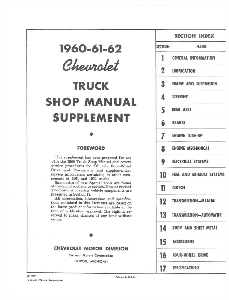 1960 1961 1962 Chevrolet Truck Shop Service Repair Manual Book Supplement Guide Published by the factory to provide information on diagnosis, service procedures, adjustments & specs, there is none better. Loaded with diagrams & illustrations to help disassemble, repair & reassemble various components. Features Factory Authorized Reproduction All Model Trucks approx 150 pages Body, Chassis, Engine, Drivetrain & Electrical Requires the 1960 Chevy Truck Shop Manual This Includes Most Complete Shop Manual Available Physical Paper Manual Numerous Illustrations and Diagrams Technical Diagnostic Procedures Disassembly and Installation Procedures Written by the Manufacturer Used by the Mechanics at the Dealership Returns We offer a 60 day 100% money back guarantee. Free Return Shipping. Customer Support Our customer support is available Mon-Fri 8:00 AM - 6:00 PM EST and Sat-Sun 10:00 AM - 2:00 PM EST. For questions and customer service please contact us. eb5059 Powered by SixBit's eCommerce Solution
