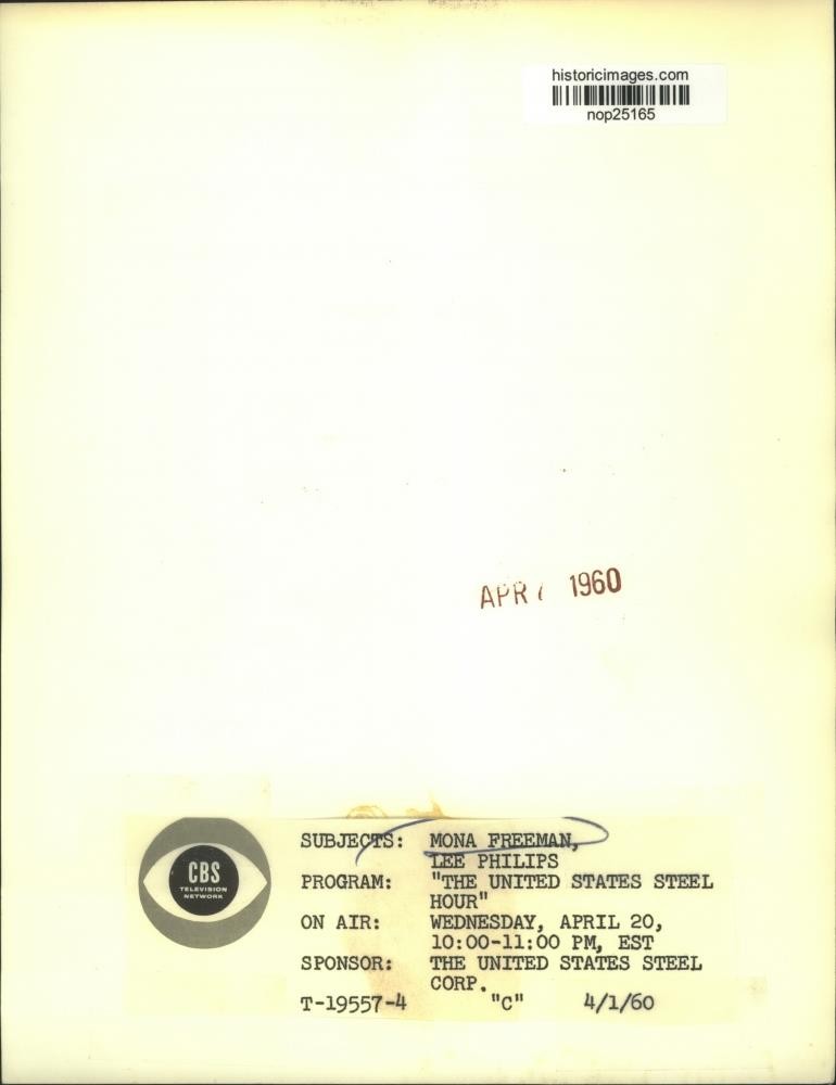 ebay template Note: Please study the images carefully to determine the condition of this vintage photograph, as it may not be in perfect condition. It may contain wrinkles, cracks, and possibly even tears due to its age and how it was handled before it got to us. A scanner may interpret colors and contrast differently than human eyes will, so it is possible that the actual photograph may be slightly darker or lighter in person. This vintage photograph is offered for sale as a collectible item and conveys no transfer of copyright. 1960 Press Photo Mona Freeman, Lee Philips, "The United States Steel Hour" This is an original press photo. Mona Freeman, Lee Philips, "The United States Steel Hour," Wednesday, April 20, 10:00-11:00 PM, EST. Sponsored by The United States Steel Corp.Photo measures 7 x 9.25 inches. Photo is dated 04-01-1960. PHOTO FRONT PHOTO BACK Historic Images Part Number: nop25165 Sell Smarter with Kyozou. Inventory and Ecommerce Management