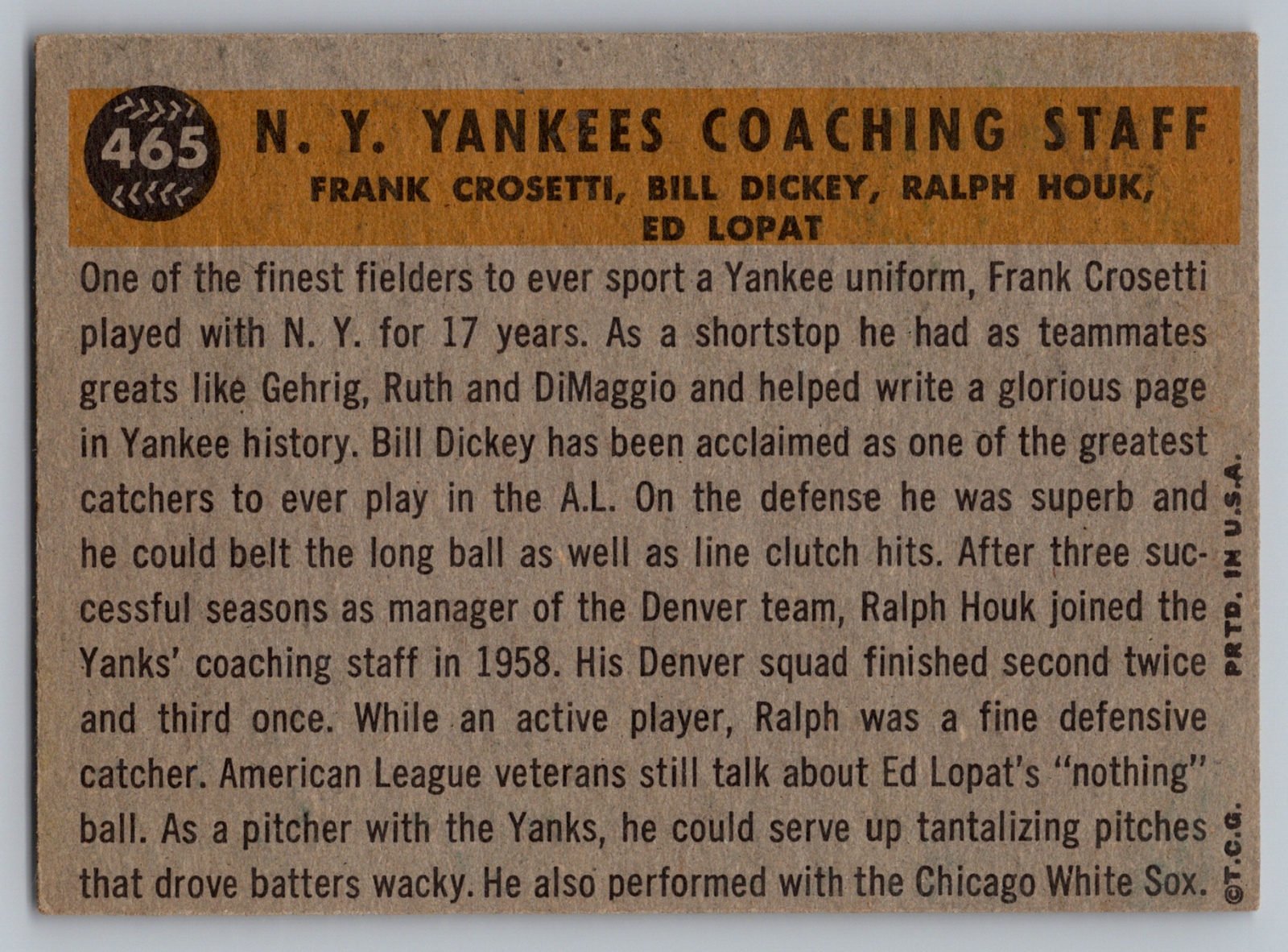 1960 TOPPS #465 FRANKIE CROSETTI/BILL DICKEY/RALPH HOUK/ED LOPAT YANKEES . CA RD HAS NO CREASE. FREE SHIPPING. Inventory #250420-3