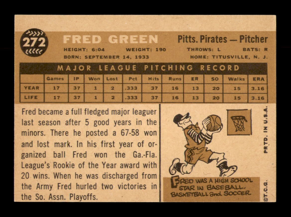 Just got this 1960 Topps Fred Green card and it’s in amazing condition—exactly as shown in the scan! The seller is super reliable, ships fast, and offers free shipping, which is a huge plus. Love that they make it easy to bundle orders and have a no-hassle return policy. Definitely recommend for any vintage card collector!
