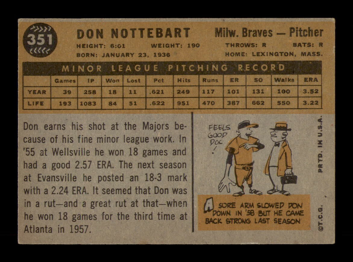 1960 Topps #351 Don Nottebart EX-MINT Condition OBGcards Vintage Baseball
