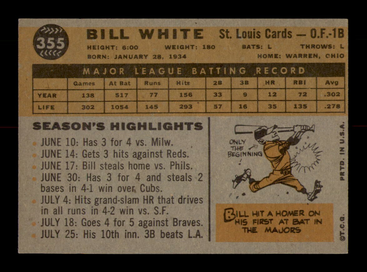 1960 Topps #355 Bill White NM Vintage Baseball Card OBGcards