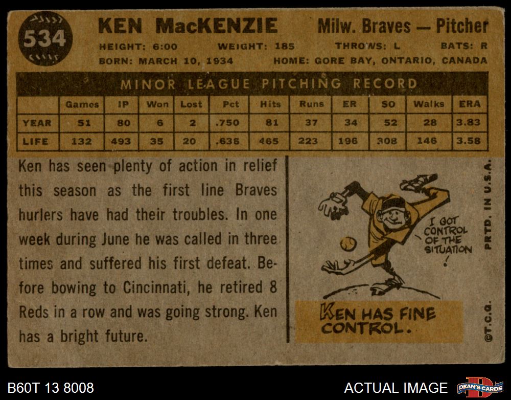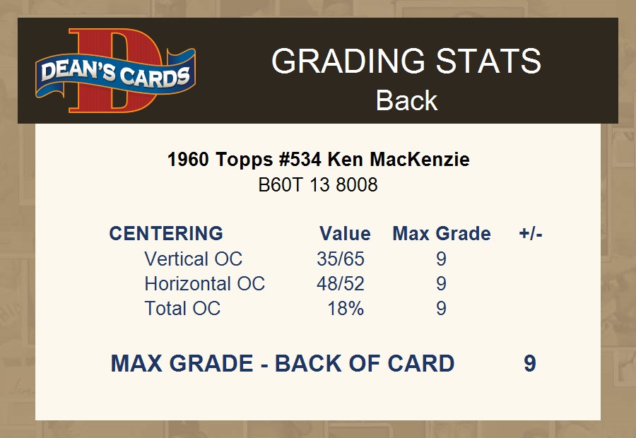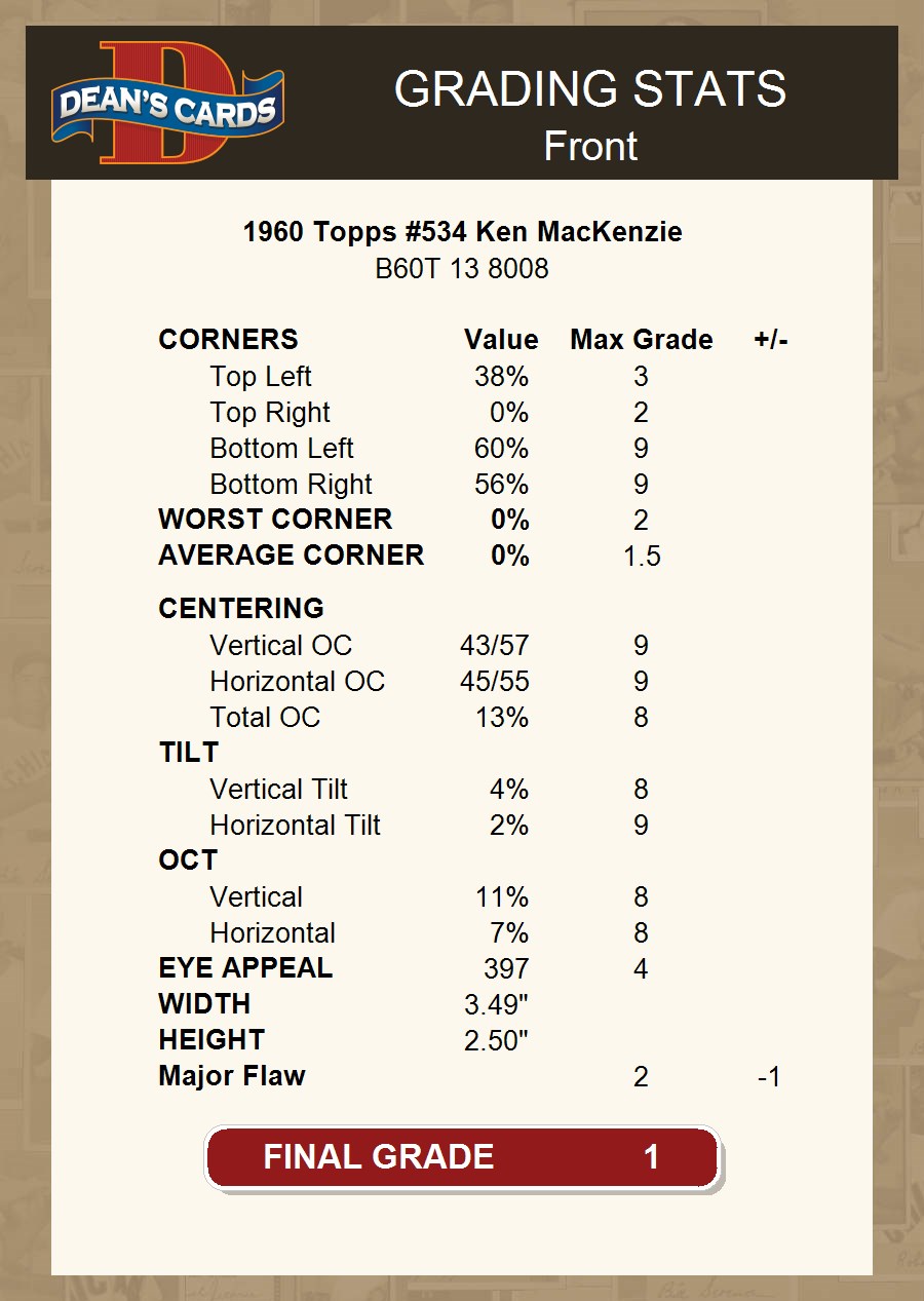 1960 Topps #534 Ken MacKenzie Braves 1 - POOR If the scan in the listing says ACTUAL IMAGE, you will receive the card pictured. For cards issued after 1983, we will often use representative images and you will not receive the exact card pictured. Shipping Policy You only pay shipping on the first item. If you order multiple items on the same order, you will only be charged once for shipping. We do not combine shipping on multiple orders. To avoid multiple shipping charges we recommend using eBay's "Add to Cart" feature to check out multiple items in one transaction, or please request and allow for us to send an invoice to reflect the combined shipping charges. Canadian customers - We send all of our Canadian/International packages with tracking and cannot make any exceptions to this policy. Negotiating Prices All prices are final and we do not negotiate. This policy is to ensure that everyone knows that they are getting our best possible price. So please do not ask us to negotiate on price. Return Policy Dean's Cards has a 100% Money Back Satisfaction Guarantee on all purchases, as long as the product is returned within 30 days of receiving the product. Card Grading Each card is first reviewed by a member of our team, in order to detect any flaws that may not be visible on a scan, such as wrinkles, creases, print spots, or light stains. The vast majority of our vintage cards are professionally graded by the Dean's Cards Grading Software and include a 100% satisfaction guarantee. Our grading is on par with PSA standards when it comes to corners, centering and flaws - and tends to grade a bit tougher than PSA, on cards with a tilted image or rough edges. This grading software was developed to provide far better grading and consistency than can be achieved using the human eye. Determining the card's grade The sharpness of the corners and the degree to which a card was cut off-center determines the maximum possible grade that the card can receive. The card's grade is further reduced by any flaws or blemishes that it may have. Each card is evaluated on the following characteristics and assigned a score. Corners - Each corner of a card is individually analyzed, and then assigned a score on how square, sharp, and flawless it appears. Centering - The borders are measured, at multiple points along the edge, to determine the horizontal and vertical centering and tilt. Defects - The card is examined for imperfections, such as: size, print flaws, dings, stains, creases, or other wear which could lower its grade. Bonus for Perfect Centering - A vintage card, with near perfect centering, is given a one-half grade bonus. So when you buy one of our cards with a half-grade (e.g. 3.5 or 6.5) it will appear perfectly centered, both vertically and horizontally. Grading Criteria Worst Corner - A card can grade only as high as the worst corner will allow. Average Corner Tilt - The difference in width of a card border near the top, compared to the bottom. OCT - The sum of how far a card is Off-Center, plus its Tilt. Minimum Centering Requirements Eye Appeal - The combination of a card's centering, corners and tilt. Well-Centered - Cards that appear perfectly centered receive a bonus of one-half grade. Flaws, defects and other imperfections - can lower a card's grade. Card Backs - the above criteria is also considered, for the back of the cards, but does not inflict as severe of a penalty to its grade. Packaging Once scanned, the cards are placed in "soft" sleeves, which have an open top for easy removal. The Dean's Cards label is placed on the top back of the card sleeve. Every card you buy features a QR Code that you can scan to see your ACTUAL CARD and its grading statistics. Please note that when images are enlarged there may be instances of vertical lines running through the scans. This was caused by a "dust speck" on the scanner and can be verified by the vertical lines running into the black margins on the top and bottom of the image. About Dean and Dean's Cards Dean's Cards Makes Card Collecting - Fast, Easy And Fun. Dean's Cards was founded in 2002 and has become the leading online seller of vintage sports cards and non-sports cards. Our inventory has grown to more than a million vintage cards and we have a staff of 15-20 employees and a 8500 sq. ft. office space in Cincinnati, Ohio.
