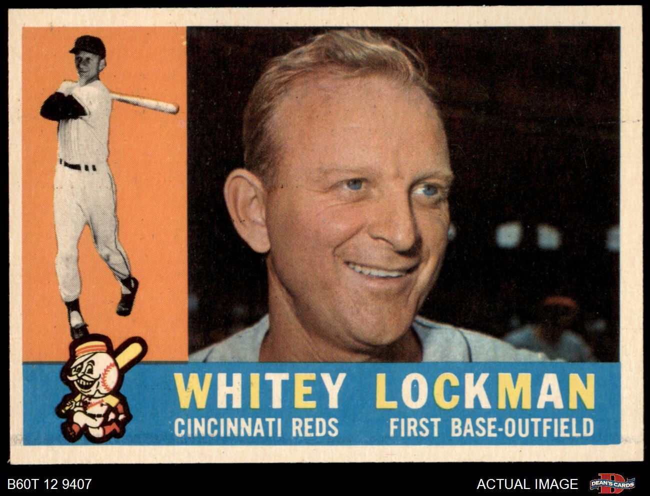 1960 Topps #535 Whitey Lockman Reds 8 - NM/MT If the scan in the listing says ACTUAL IMAGE, you will receive the card pictured. For cards issued after 1983, we will often use representative images and you will not receive the exact card pictured. Shipping Policy You only pay shipping on the first item. If you order multiple items on the same order, you will only be charged once for shipping. We do not combine shipping on multiple orders. To avoid multiple shipping charges we recommend using eBay's "Add to Cart" feature to check out multiple items in one transaction, or please request and allow for us to send an invoice to reflect the combined shipping charges. Canadian customers - We send all of our Canadian/International packages with tracking and cannot make any exceptions to this policy. Negotiating Prices All prices are final and we do not negotiate. This policy is to ensure that everyone knows that they are getting our best possible price. So please do not ask us to negotiate on price. Return Policy Dean's Cards has a 100% Money Back Satisfaction Guarantee on all purchases, as long as the product is returned within 30 days of receiving the product. Card Grading Each card is first reviewed by a member of our team, in order to detect any flaws that may not be visible on a scan, such as wrinkles, creases, print spots, or light stains. The vast majority of our vintage cards are professionally graded by the Dean's Cards Grading Software and include a 100% satisfaction guarantee. Our grading is on par with PSA standards when it comes to corners, centering and flaws - and tends to grade a bit tougher than PSA, on cards with a tilted image or rough edges. This grading software was developed to provide far better grading and consistency than can be achieved using the human eye. Determining the card's grade The sharpness of the corners and the degree to which a card was cut off-center determines the maximum possible grade that the card can receive. The card's grade is further reduced by any flaws or blemishes that it may have. Each card is evaluated on the following characteristics and assigned a score. Corners - Each corner of a card is individually analyzed, and then assigned a score on how square, sharp, and flawless it appears. Centering - The borders are measured, at multiple points along the edge, to determine the horizontal and vertical centering and tilt. Defects - The card is examined for imperfections, such as: size, print flaws, dings, stains, creases, or other wear which could lower its grade. Bonus for Perfect Centering - A vintage card, with near perfect centering, is given a one-half grade bonus. So when you buy one of our cards with a half-grade (e.g. 3.5 or 6.5) it will appear perfectly centered, both vertically and horizontally. Grading Criteria Worst Corner - A card can grade only as high as the worst corner will allow. Average Corner Tilt - The difference in width of a card border near the top, compared to the bottom. OCT - The sum of how far a card is Off-Center, plus its Tilt. Minimum Centering Requirements Eye Appeal - The combination of a card's centering, corners and tilt. Well-Centered - Cards that appear perfectly centered receive a bonus of one-half grade. Flaws, defects and other imperfections - can lower a card's grade. Card Backs - the above criteria is also considered, for the back of the cards, but does not inflict as severe of a penalty to its grade. Packaging Once scanned, the cards are placed in "soft" sleeves, which have an open top for easy removal. The Dean's Cards label is placed on the top back of the card sleeve. Every card you buy features a QR Code that you can scan to see your ACTUAL CARD and its grading statistics. Please note that when images are enlarged there may be instances of vertical lines running through the scans. This was caused by a "dust speck" on the scanner and can be verified by the vertical lines running into the black margins on the top and bottom of the image. About Dean and Dean's Cards Dean's Cards Makes Card Collecting - Fast, Easy And Fun. Dean's Cards was founded in 2002 and has become the leading online seller of vintage sports cards and non-sports cards. Our inventory has grown to more than a million vintage cards and we have a staff of 15-20 employees and a 8500 sq. ft. office space in Cincinnati, Ohio.