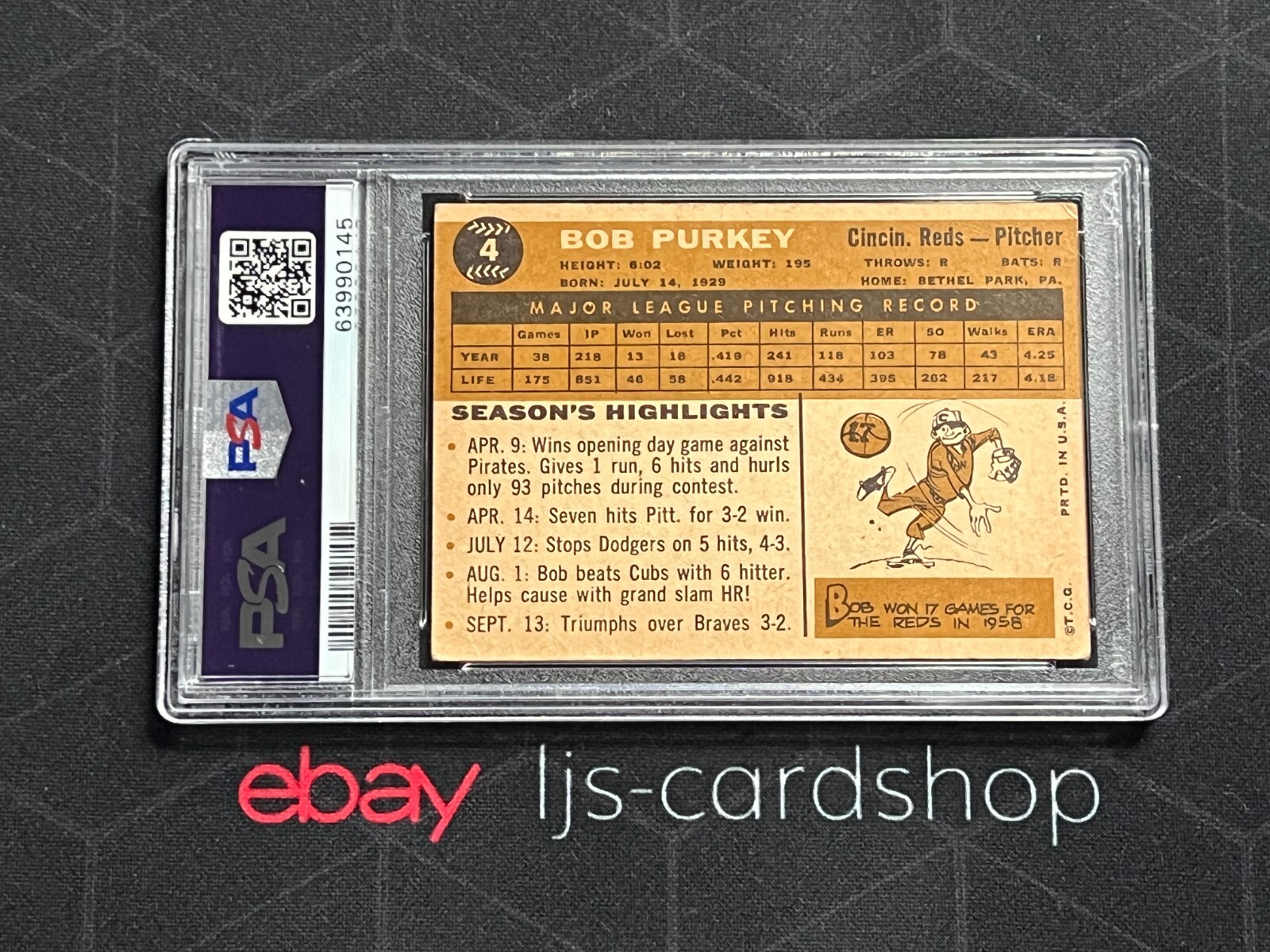 Capture a slice of baseball history with the 1960 Topps #4 Bob Purkey card, featuring the iconic Cincinnati Reds pitcher. This vintage collectible, part of the revered 1960 Topps set, showcases the sport's golden era and is a must-have for any serious collector. Graded PSA 7, this card is in excellent shape considering its age, making it a noteworthy addition to any collection. Celebrate the legacy of Major League Baseball and the storied career of Bob Purkey with this cherished piece of sports memorabilia.