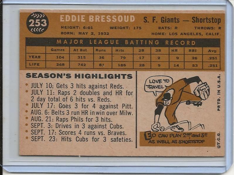 This is a fantastic find for any vintage baseball card collector! The 1960 Topps Eddie Bressoud #253 is in great condition, and the high-quality scan ensures you know exactly what you're getting. Free shipping and fast delivery make it even better. The seller offers a hassle-free 30-day return policy, so you can buy with confidence. Perfect for adding to your collection or as a gift for a fellow fan. Don’t miss out on this classic piece of baseball history!