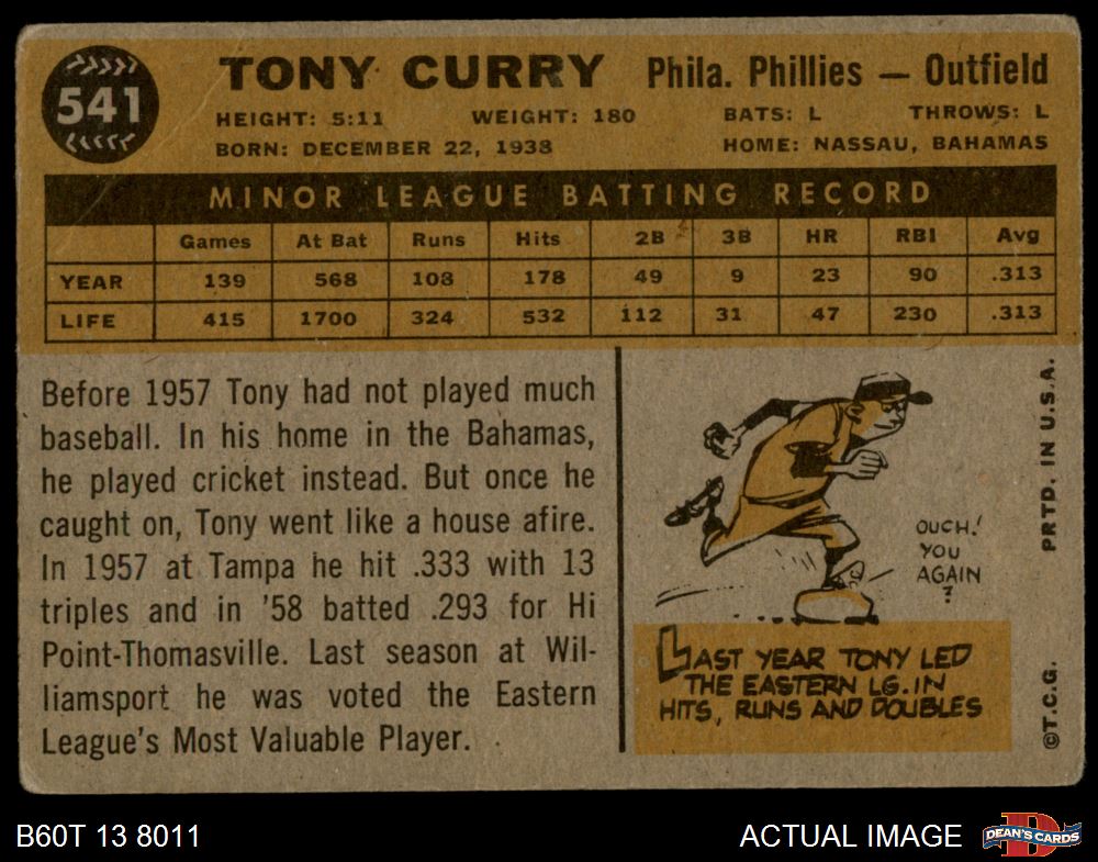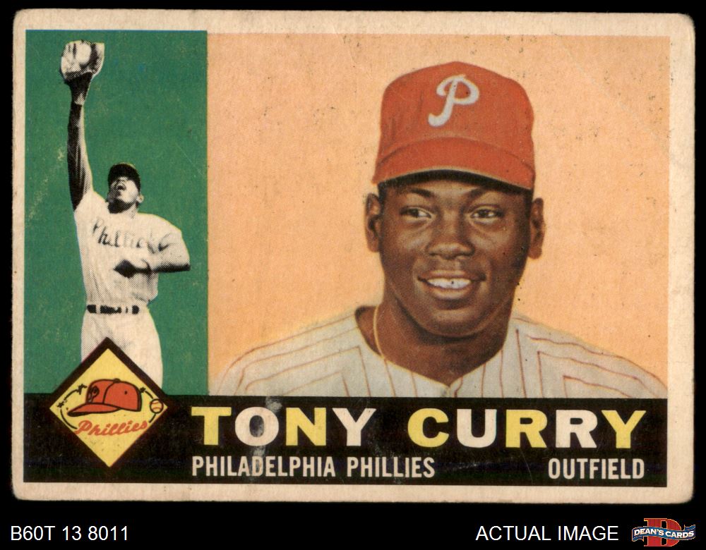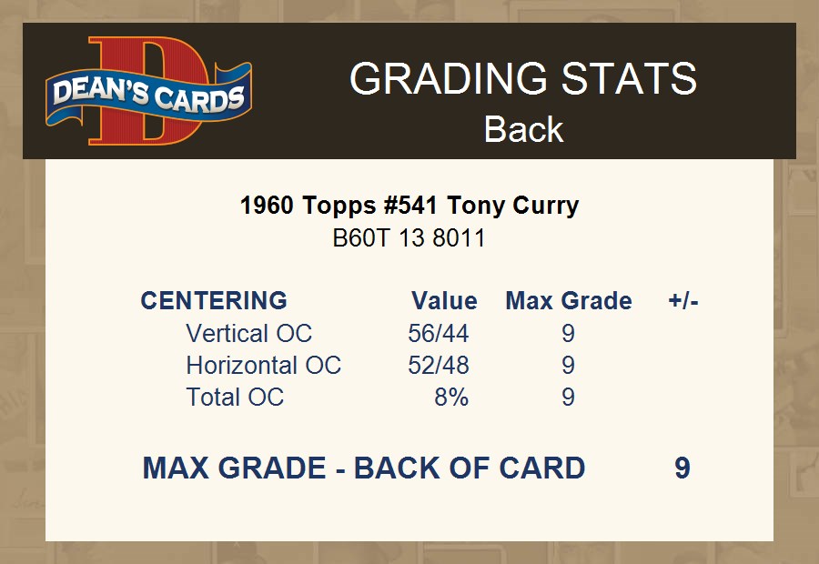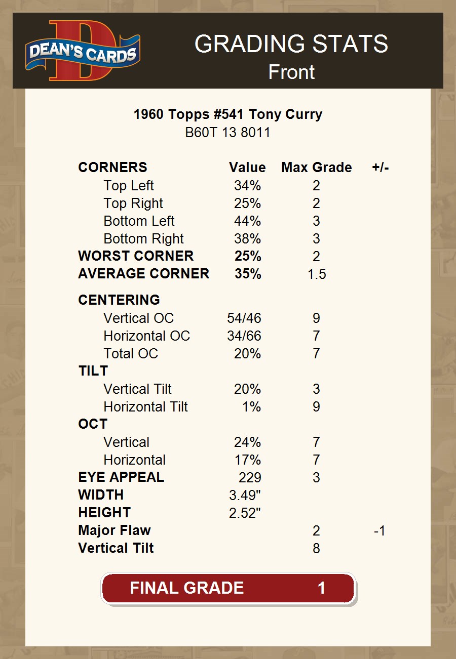 1960 Topps #541 Tony Curry Phillies 1 - POOR If the scan in the listing says ACTUAL IMAGE, you will receive the card pictured. For cards issued after 1983, we will often use representative images and you will not receive the exact card pictured. Shipping Policy You only pay shipping on the first item. If you order multiple items on the same order, you will only be charged once for shipping. We do not combine shipping on multiple orders. To avoid multiple shipping charges we recommend using eBay's "Add to Cart" feature to check out multiple items in one transaction, or please request and allow for us to send an invoice to reflect the combined shipping charges. Canadian customers - We send all of our Canadian/International packages with tracking and cannot make any exceptions to this policy. Negotiating Prices All prices are final and we do not negotiate. This policy is to ensure that everyone knows that they are getting our best possible price. So please do not ask us to negotiate on price. Return Policy Dean's Cards has a 100% Money Back Satisfaction Guarantee on all purchases, as long as the product is returned within 30 days of receiving the product. Card Grading Each card is first reviewed by a member of our team, in order to detect any flaws that may not be visible on a scan, such as wrinkles, creases, print spots, or light stains. The vast majority of our vintage cards are professionally graded by the Dean's Cards Grading Software and include a 100% satisfaction guarantee. Our grading is on par with PSA standards when it comes to corners, centering and flaws - and tends to grade a bit tougher than PSA, on cards with a tilted image or rough edges. This grading software was developed to provide far better grading and consistency than can be achieved using the human eye. Determining the card's grade The sharpness of the corners and the degree to which a card was cut off-center determines the maximum possible grade that the card can receive. The card's grade is further reduced by any flaws or blemishes that it may have. Each card is evaluated on the following characteristics and assigned a score. Corners - Each corner of a card is individually analyzed, and then assigned a score on how square, sharp, and flawless it appears. Centering - The borders are measured, at multiple points along the edge, to determine the horizontal and vertical centering and tilt. Defects - The card is examined for imperfections, such as: size, print flaws, dings, stains, creases, or other wear which could lower its grade. Bonus for Perfect Centering - A vintage card, with near perfect centering, is given a one-half grade bonus. So when you buy one of our cards with a half-grade (e.g. 3.5 or 6.5) it will appear perfectly centered, both vertically and horizontally. Grading Criteria Worst Corner - A card can grade only as high as the worst corner will allow. Average Corner Tilt - The difference in width of a card border near the top, compared to the bottom. OCT - The sum of how far a card is Off-Center, plus its Tilt. Minimum Centering Requirements Eye Appeal - The combination of a card's centering, corners and tilt. Well-Centered - Cards that appear perfectly centered receive a bonus of one-half grade. Flaws, defects and other imperfections - can lower a card's grade. Card Backs - the above criteria is also considered, for the back of the cards, but does not inflict as severe of a penalty to its grade. Packaging Once scanned, the cards are placed in "soft" sleeves, which have an open top for easy removal. The Dean's Cards label is placed on the top back of the card sleeve. Every card you buy features a QR Code that you can scan to see your ACTUAL CARD and its grading statistics. Please note that when images are enlarged there may be instances of vertical lines running through the scans. This was caused by a "dust speck" on the scanner and can be verified by the vertical lines running into the black margins on the top and bottom of the image. About Dean and Dean's Cards Dean's Cards Makes Card Collecting - Fast, Easy And Fun. Dean's Cards was founded in 2002 and has become the leading online seller of vintage sports cards and non-sports cards. Our inventory has grown to more than a million vintage cards and we have a staff of 15-20 employees and a 8500 sq. ft. office space in Cincinnati, Ohio.