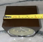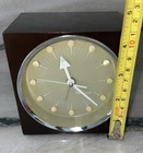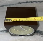 Add a touch of vintage charm to your bedroom with this 1960s Bulova wind-up alarm clock. With a square shape and silver finish, this clock features an analog display type and a mechanical movement. The clock is made of chrome and plastic materials, with a frame made of chrome. The clock is a true space age relic, with a fun atomic design featuring the character Atom. It is a original vintage piece from Japan, manufactured in the mid-20th century. This alarm clock is a great addition to any collection, and is sure to be a conversation starter. Good vintage condition WORKS!! Brown with beige and I believe the dots glow in the dark. Some surface scratches but no cracks beautiful for its age!! As is no returns please…