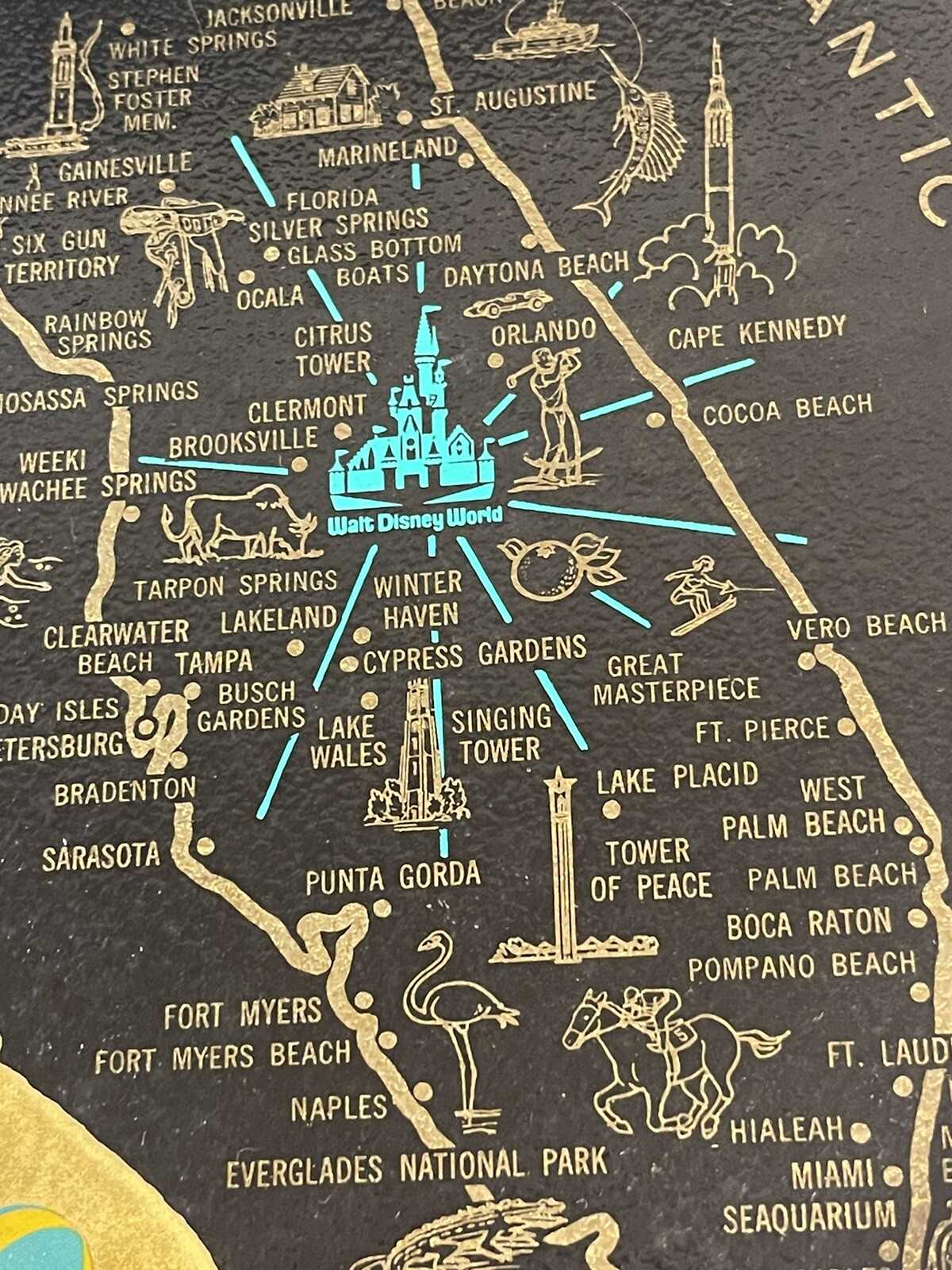 This vintage Walt Disney World serving tray features a colorful map of Florida with Mickey Mouse at the center. The tin tray is from the 1960s and is a perfect addition to any Disneyana or theme park souvenir collection. The tray is in great shape and has no signs of wear and tear. It is a great way to showcase your love for Disney and add a touch of nostalgia to your home decor.11" wide. T hank you for looking. This item is from a smoke free home. Please view all the photos. Check out all my other items. We ship in the US only.