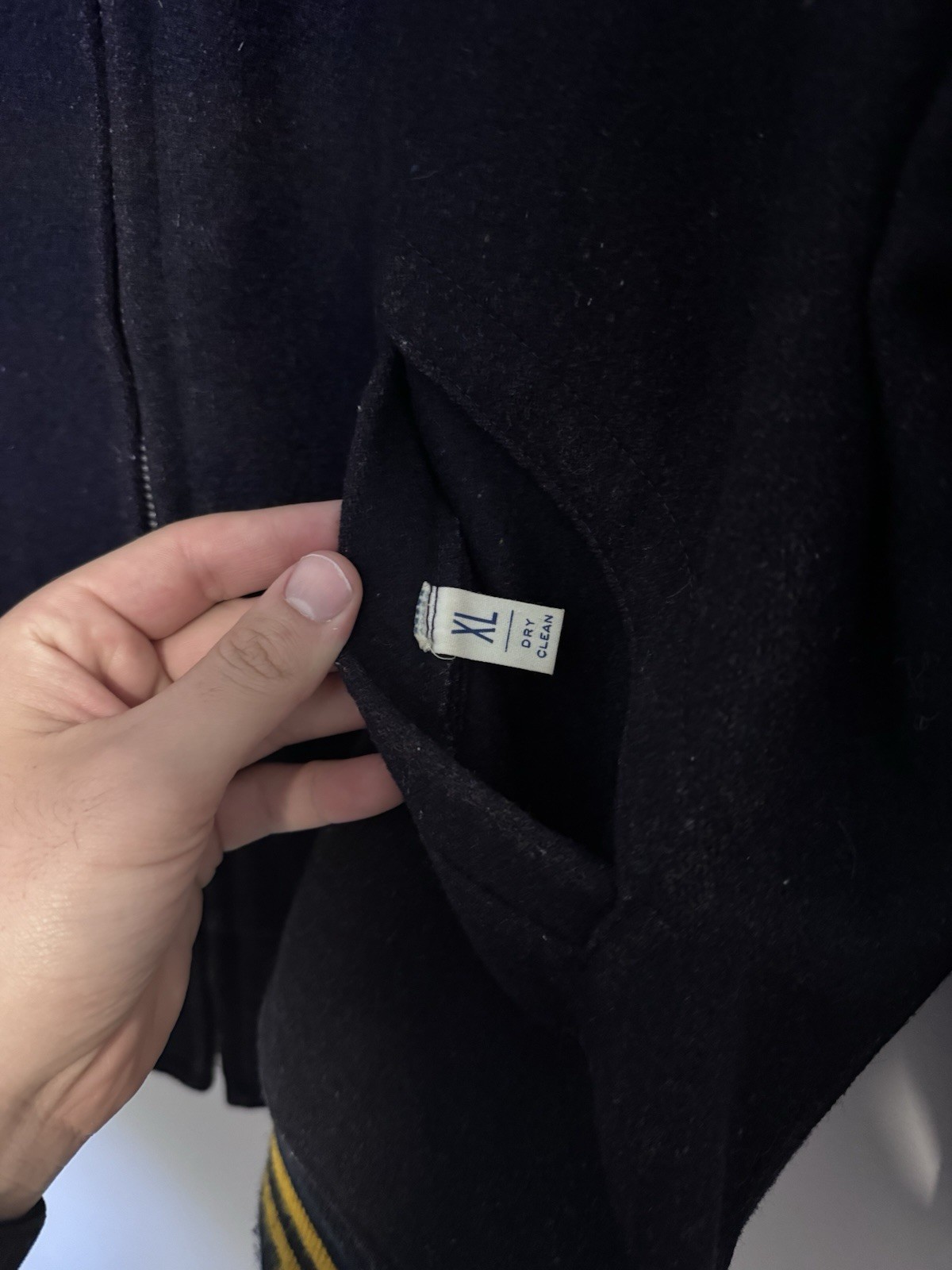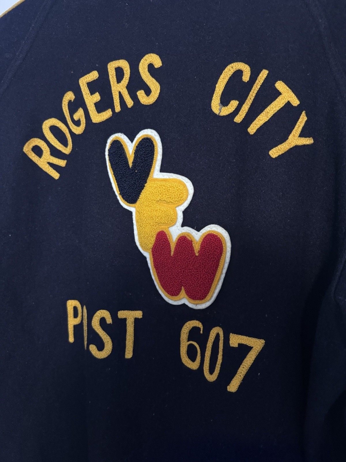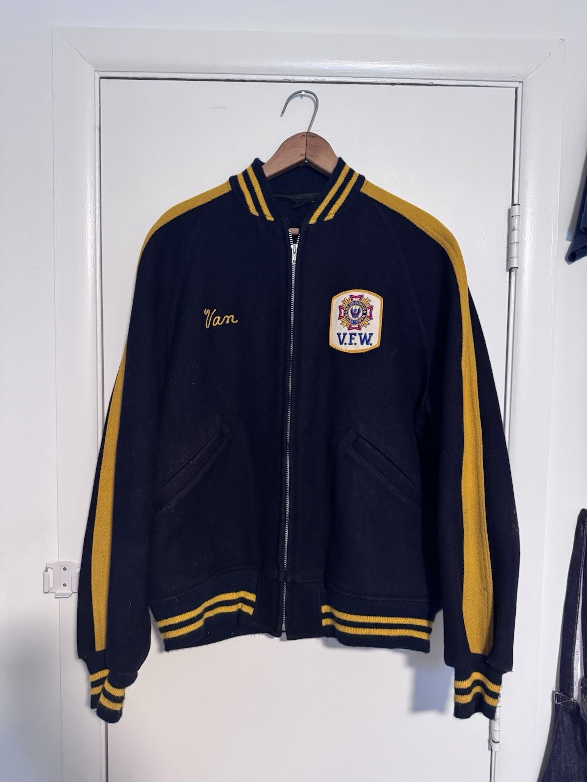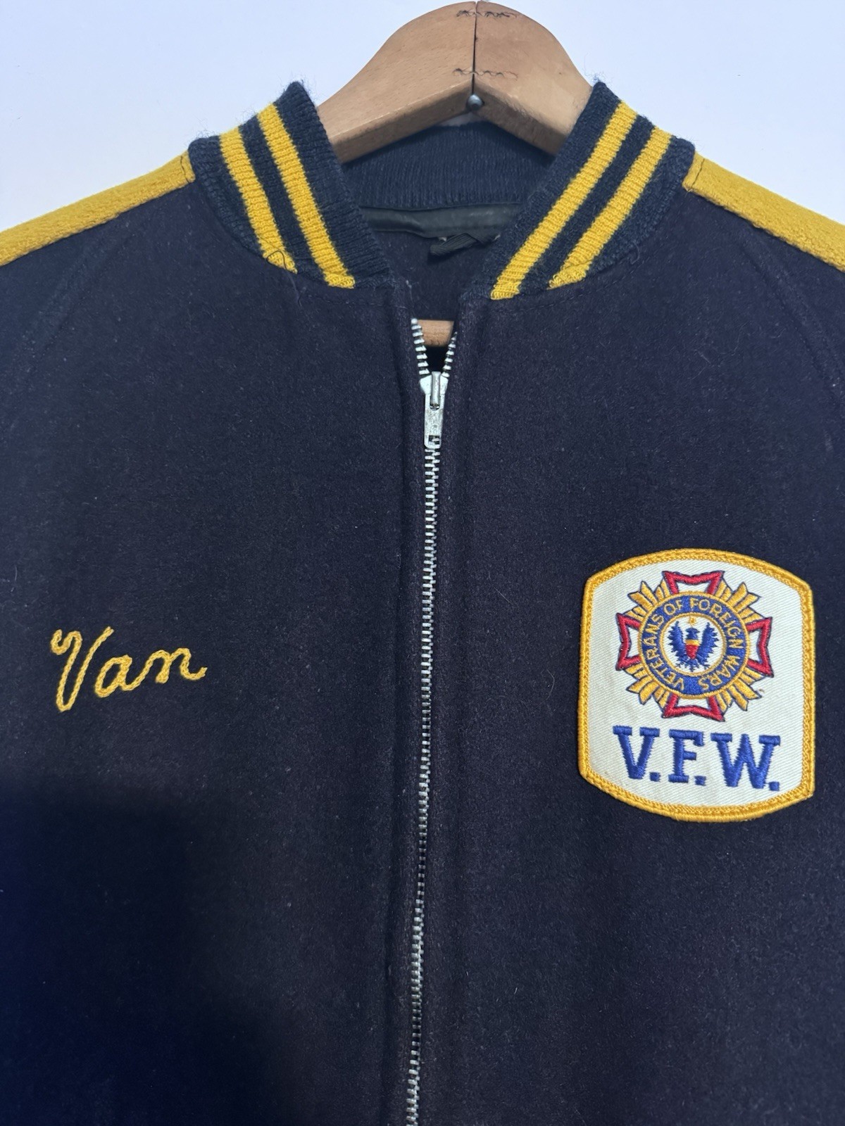 25x26 The product is a 1960s Vintage Chainstitched VFW Roger's City Jacket in men's size XL. Made from a wool blend material, this original bomber/harrington style jacket in blue color is a perfect addition for casual occasions. The iconic design and high-quality material make it a sought-after piece for vintage clothing collectors.