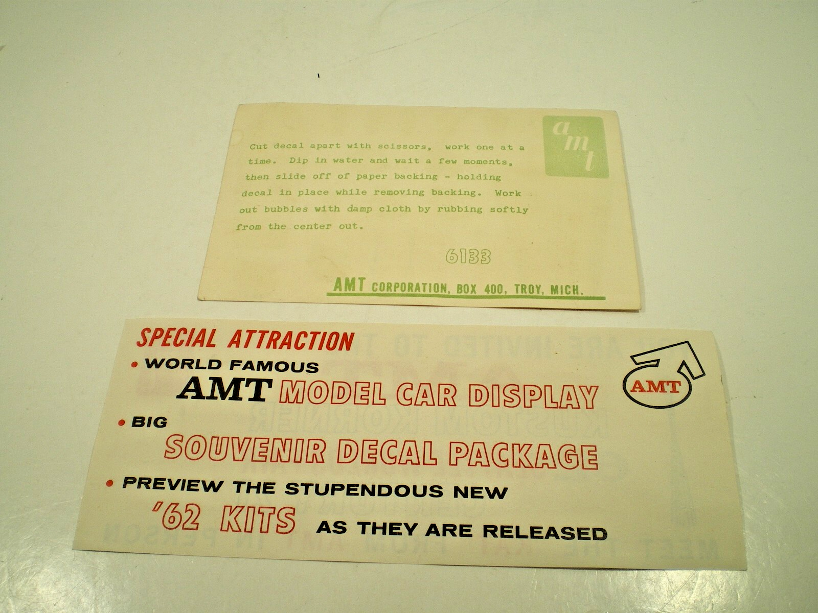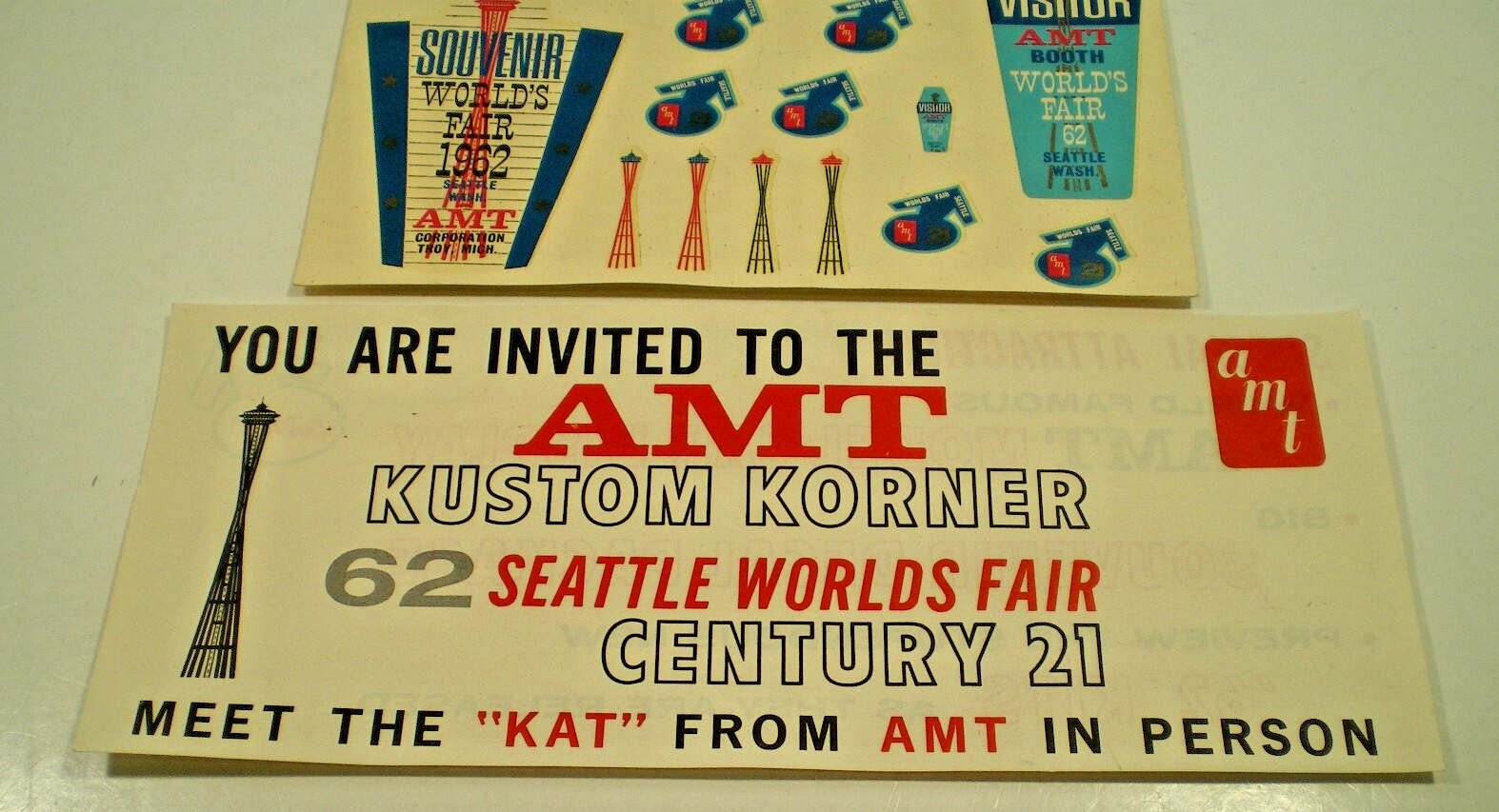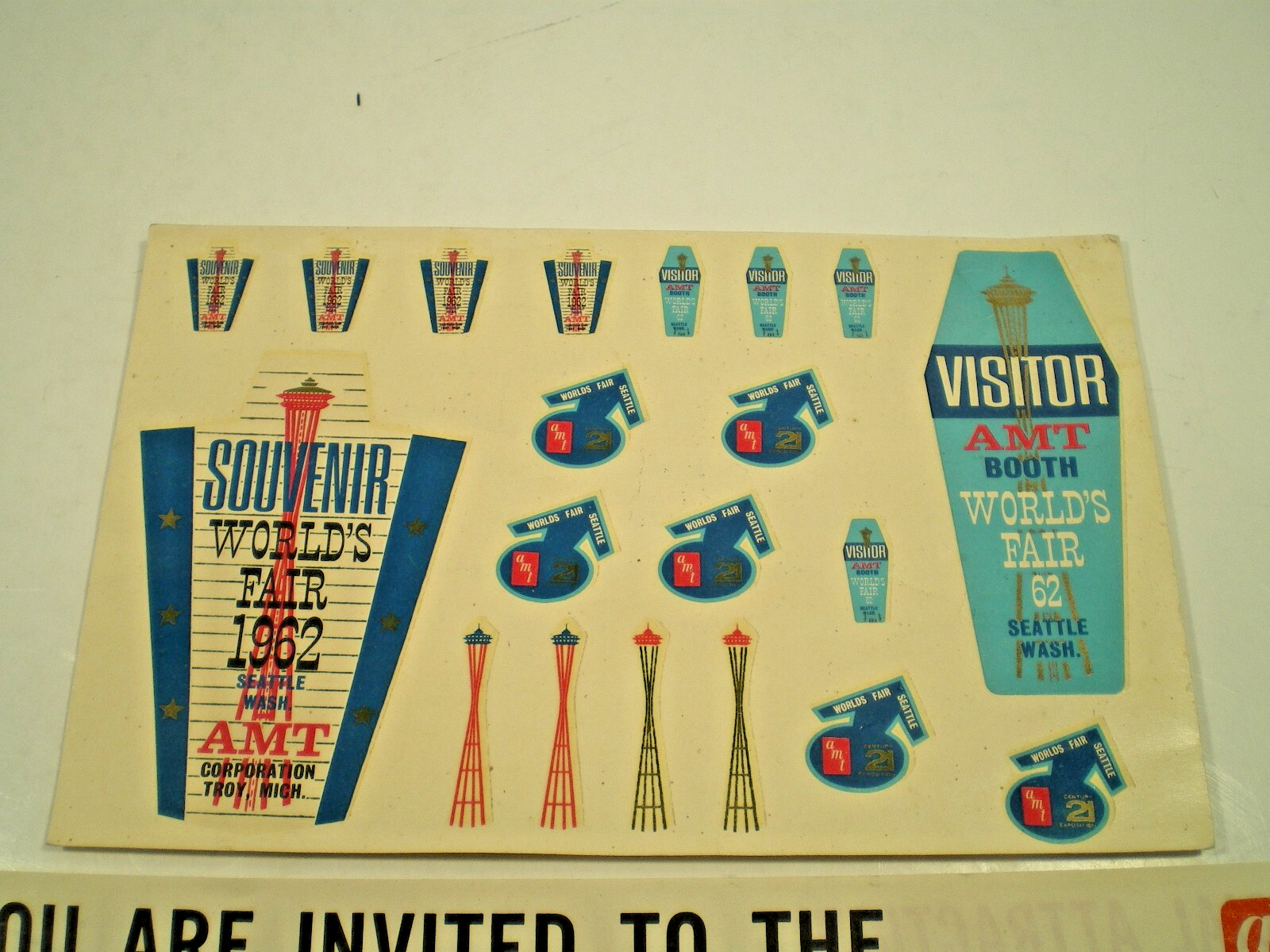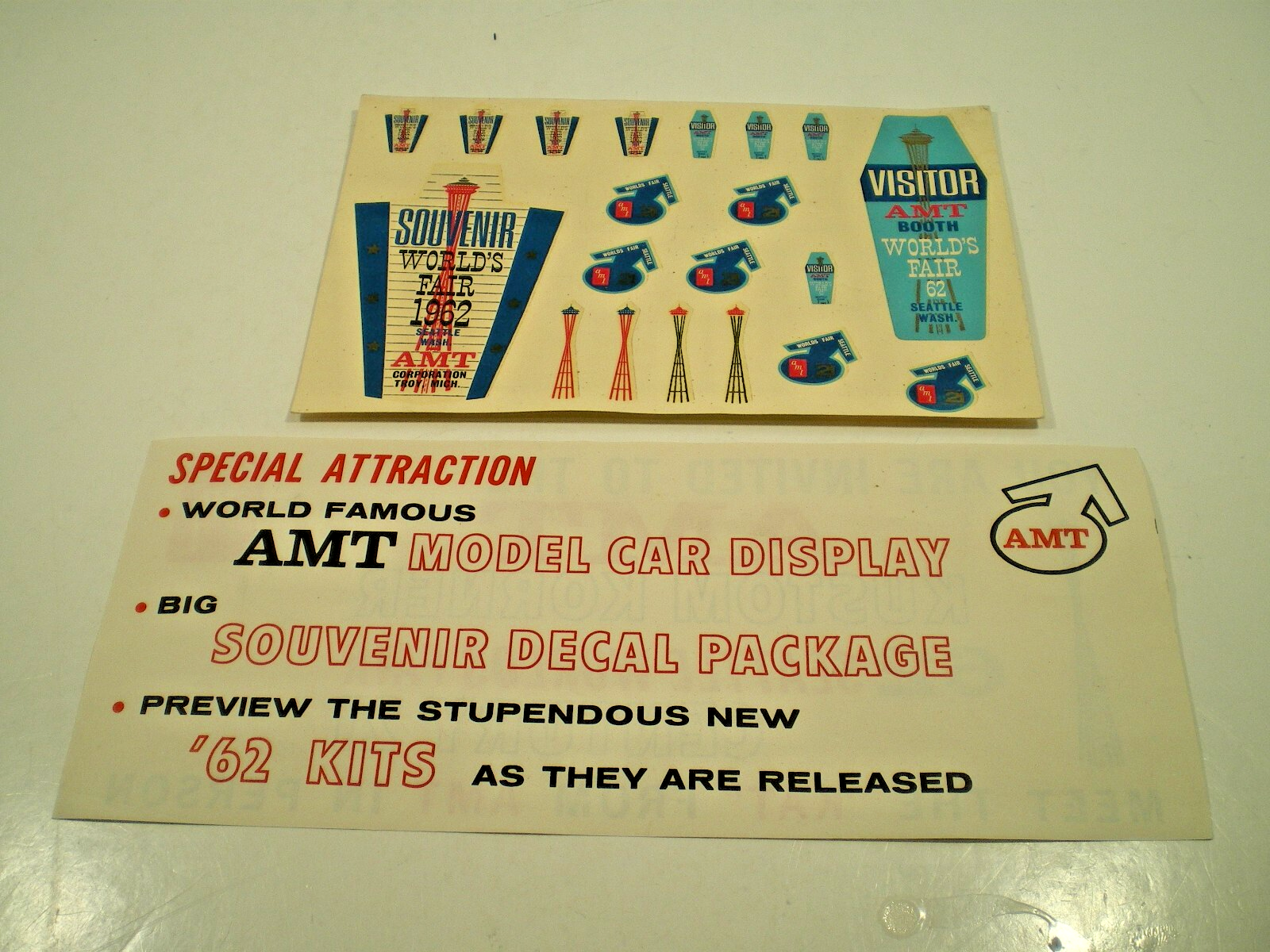 AMT BOOTH Model Kits decal sheet From 1962 WORLDS FAIR, Seattle Century 21 rare AMT Model Kit water slide decal from 1962 WORLDS FAIR Century 21 Seattle colorful and unused with some shop wear very scarce great for a rat rod window! overall approx. 6" x 4." wide due to the age of the decal we can not guarantee its functionality please view all the photos to make an intelligent decision on condition. This sheet is old and may not work due to its age. It has been kept high and dry in sleeves for many years and may be yellowed, stained or not usable? This is only a general description of condition what you see is what you get! (see pics) I try to describe the condition in general to the best of my ability, so examine the pics well and if you have questions don't hesitate to ask? "ALL SALES ARE FINAL NO RETURNS SOLD AS IS" Check out my other auctions for many other MODEL CAR goodies BE SURE TO CHECK OUT OUR EBAY STORE FOR MORE GREAT VINTAGE GOODIES! SHIPPNG ANYWHERE IN CANADA & USA $10.00 U.K & EU will be more (ASK?) THANKS FOR LOOKING!