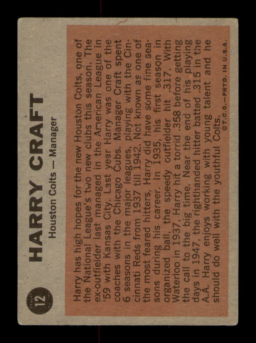 1962 Topps #12 Harry Craft Manager VG Vintage Baseball Card OBGcards