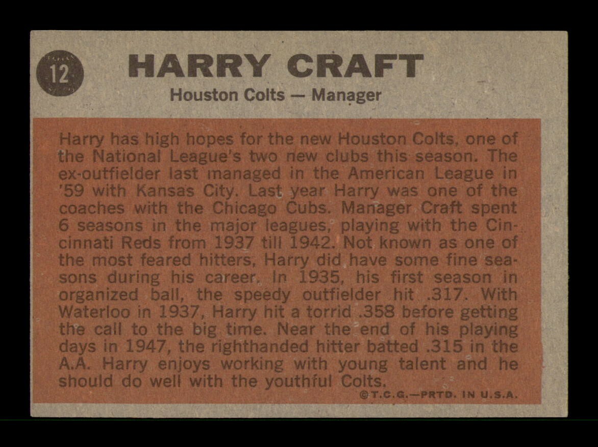 1962 Topps #12 Harry Craft Manager NM-MT Condition OBGcards Vintage Baseball