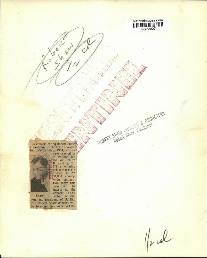 ebay template Note: Please study the images carefully to determine the condition of this vintage photograph, as it may not be in perfect condition. It may contain wrinkles, cracks, and possibly even tears due to its age and how it was handled before it got to us. A scanner may interpret colors and contrast differently than human eyes will, so it is possible that the actual photograph may be slightly darker or lighter in person. This vintage photograph is offered for sale as a collectible item and conveys no transfer of copyright. 1963 Press Photo Robert Shaw, Chorale and Orchestra Conductor. - mjx53827 This is an original press photo. A concert of the Robert Shaw chorale and orchestra on Washington's birthday, 1964, will be sponsored in Milwaukee by the Joseph Schlitz Brewing Company. Nine winning choruses chosen in an $1,800 countywide competition later this year will be guests at the concert, said Robert A. Uihlein, Junior, president of Schlitz. The Robert Shaw concert will be televised live overt WTMJ. Robert Shaw Chorale and Orchestra Conductor Photo measures 8 x 10 inches. Photo is dated 03-11-1963. PHOTO FRONT PHOTO BACK Historic Images Part Number: mjx53827 Sell Smarter with Kyozou. Inventory and Ecommerce Management