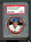 1963 Salada Metal Coins #17 Ernie Banks Cubs HALL-OF-FAME PSA 5 - EX If the scan in the listing says ACTUAL IMAGE, you will receive the card pictured. For cards issued after 1983, we will often use representative images and you will not receive the exact card pictured. Shipping Policy You only pay shipping on the first item. If you order multiple items on the same order, you will only be charged once for shipping. We do not combine shipping on multiple orders. To avoid multiple shipping charges we recommend using eBay's "Add to Cart" feature to check out multiple items in one transaction, or please request and allow for us to send an invoice to reflect the combined shipping charges. Canadian customers - We send all of our Canadian/International packages with tracking and cannot make any exceptions to this policy. Negotiating Prices All prices are final and we do not negotiate. This policy is to ensure that everyone knows that they are getting our best possible price. So please do not ask us to negotiate on price. Return Policy Dean's Cards has a 100% Money Back Satisfaction Guarantee on all purchases, as long as the product is returned within 30 days of receiving the product. Card Grading Each card is first reviewed by a member of our team, in order to detect any flaws that may not be visible on a scan, such as wrinkles, creases, print spots, or light stains. The vast majority of our vintage cards are professionally graded by the Dean's Cards Grading Software and include a 100% satisfaction guarantee. Our grading is on par with PSA standards when it comes to corners, centering and flaws - and tends to grade a bit tougher than PSA, on cards with a tilted image or rough edges. This grading software was developed to provide far better grading and consistency than can be achieved using the human eye. Determining the card's grade The sharpness of the corners and the degree to which a card was cut off-center determines the maximum possible grade that the card can receive. The card's grade is further reduced by any flaws or blemishes that it may have. Each card is evaluated on the following characteristics and assigned a score. Corners - Each corner of a card is individually analyzed, and then assigned a score on how square, sharp, and flawless it appears. Centering - The borders are measured, at multiple points along the edge, to determine the horizontal and vertical centering and tilt. Defects - The card is examined for imperfections, such as: size, print flaws, dings, stains, creases, or other wear which could lower its grade. Bonus for Perfect Centering - A vintage card, with near perfect centering, is given a one-half grade bonus. So when you buy one of our cards with a half-grade (e.g. 3.5 or 6.5) it will appear perfectly centered, both vertically and horizontally. Grading Criteria Worst Corner - A card can grade only as high as the worst corner will allow. Average Corner Tilt - The difference in width of a card border near the top, compared to the bottom. OCT - The sum of how far a card is Off-Center, plus its Tilt. Minimum Centering Requirements Eye Appeal - The combination of a card's centering, corners and tilt. Well-Centered - Cards that appear perfectly centered receive a bonus of one-half grade. Flaws, defects and other imperfections - can lower a card's grade. Card Backs - the above criteria is also considered, for the back of the cards, but does not inflict as severe of a penalty to its grade. Packaging Once scanned, the cards are placed in "soft" sleeves, which have an open top for easy removal. The Dean's Cards label is placed on the top back of the card sleeve. Every card you buy features a QR Code that you can scan to see your ACTUAL CARD and its grading statistics. Please note that when images are enlarged there may be instances of vertical lines running through the scans. This was caused by a "dust speck" on the scanner and can be verified by the vertical lines running into the black margins on the top and bottom of the image. About Dean and Dean's Cards Dean's Cards Makes Card Collecting - Fast, Easy And Fun. Dean's Cards was founded in 2002 and has become the leading online seller of vintage sports cards and non-sports cards. Our inventory has grown to more than a million vintage cards and we have a staff of 15-20 employees and a 8500 sq. ft. office space in Cincinnati, Ohio.