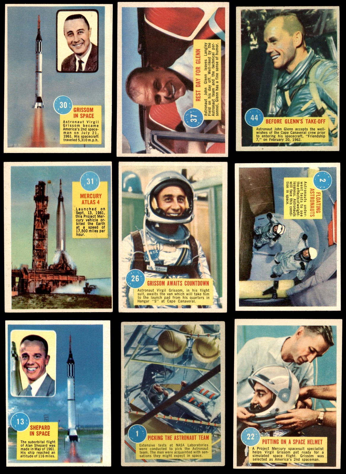 This set contains the following cards 1963 Topps Astronauts 3-D Viewer 4 - VG/EX Front Back 1963 Topps Astronauts #1 Picking the Astronaut Team 5 - EX Front Back 1963 Topps Astronauts #2 Floating Astronauts 5 - EX Front Back 1963 Topps Astronauts #3 Testing the Chimps 4 - VG/EX Front Back 1963 Topps Astronauts #4 In Orbit 4 - VG/EX Front Back 1963 Topps Astronauts #7 The Seven Astronauts 4 - VG/EX Front Back 1963 Topps Astronauts #8 Takeoff Inspection 3 - VG Front Back 1963 Topps Astronauts #9 - Wally Schirra Training the Astronaut 5 - EX Front Back 1963 Topps Astronauts #12 Awaiting the Take-off 5 - EX Front Back 1963 Topps Astronauts #13 - Alan Shepard Shepard in Space 5 - EX Front Back 1963 Topps Astronauts #16 Carrying the Capsule 5 - EX Front Back 1963 Topps Astronauts #17 - Alan Shepard Back from Space 5 - EX Front Back 1963 Topps Astronauts #19 - Gus Grissom Reporting New Information 5 - EX Front Back 1963 Topps Astronauts #20 - Gus Grissom Spacesuit Checkup 4 - VG/EX Front Back 1963 Topps Astronauts #22 - Gus Grissom Putting on Space Helmet 5 - EX Front Back 1963 Topps Astronauts #23 - Gus Grissom Putting on his parachute 5 - EX Front Back 1963 Topps Astronauts #24 - Gus Grissom Grissom in pressure suit 5 - EX Front Back 1963 Topps Astronauts #25 - Gus Grissom Final checkup 5 - EX Front Back 1963 Topps Astronauts #26 - Gus Grissom Grissom awaits countdown 3 - VG Front Back 1963 Topps Astronauts #27 - Gus Grissom Grissom Gets Ready 4 - VG/EX Front Back 1963 Topps Astronauts #29 Grissom Blasts Off 4 - VG/EX Front Back 1963 Topps Astronauts #30 - Gus Grissom Grissom in Space 5 - EX Front Back 1963 Topps Astronauts #31 Mercury Atlas 4 4 - VG/EX Front Back 1963 Topps Astronauts #33 - John Glenn Glenn and the F-106 5 - EX Front Back 1963 Topps Astronauts #34 - John Glenn Space Hero 4 - VG/EX Front Back 1963 Topps Astronauts #36 - John Glenn Taking Break 4 - VG/EX Front Back 1963 Topps Astronauts #37 - John Glenn Rest day for Glenn 5 - EX Front Back 1963 Topps Astronauts #39 - John Glenn Checking his suit 5 - EX Front Back 1963 Topps Astronauts #40 - John Glenn Inside the test chamber 5 - EX Front Back 1963 Topps Astronauts #41 - John Glenn Glenn in training 4 - VG/EX Front Back 1963 Topps Astronauts #44 - John Glenn Before Glenn's take off 5 - EX Front Back 1963 Topps Astronauts #46 - John Glenn 1st man in Orbit 2 - GOOD Front Back 1963 Topps Astronauts #48 - John Glenn / Gus Grissom / Alan Shepard Our 1st Spacemen 5 - EX Front Back 1963 Topps Astronauts #50 - Scott Carpenter Carpenter Checks His Suit 4 - VG/EX Front Back 1963 Topps Astronauts #52 - Gordon Cooper Astronaut Gordon Cooper 3 - VG Front Back 1963 Topps Astronauts #53 - Wally Schirra Astronaut Walter Schirra 5 - EX Front Back 1963 Topps Astronauts #54 Astronaut in Flight Suits 5 - EX Front Back This 1963 Topps Astronaut 3-D Almost Complete Set consists of the majority of the 55 standard sized cards, each measuring 2 by 3 inches. The 1963 Topps Astronaut 3-D cards feature NASA's Mercury 7 astronauts, their training, equipment, capsules, and flights in space that were made famous in the movie, The Right Stuff.?? The cards are easily identified by green and orange pictures of men in space.? The 1963 Topps Astronaut 3-D cards were not issued in large numbers and complete sets are getting very difficult to locate. Set breakdown by grade: Number of Cards in Set 37 Average Grade - Weighted by Value 4.55 - VG/EX+ Average Grade - Unweighted 4.43 - VG/EX+ Grade Breakdown 5 - EX 21 4 - VG/EX 12 3 - VG 3 2 - GOOD 1 . This almost complete set contains 37 cards out of the possible 56 cards. This is not a complete set. This set does not include the following cards: #5 Recovery Training, #6 Space Explorers, #10 Astronaut Alan Shepard, #11 The First US Astronaut - Alan Shepard, #14 Picking up Shepard - Alan Shepard, #15 Successful Recovery, #18 Astronaut Virgil Grissom - Gus Grissom, #21 Grissom in Spacesuit - Gus Grissom, #28 2nd US Spaceman - Gus Grissom, #32 Astronaut John Glenn - John Glenn, #35 Glenn and Grissom - John Glenn, #38 Getting into the suit - John Glenn, #42 Posing for photographers - John Glenn, #43 Studying his maps - John Glenn, #45 Glenn in Space - John Glenn, #47 Glenn Meets the President - John Glenn, #49 Astronaut Carpenter - Scott Carpenter, #51 Astronaut Donald Slayton - Deke Slayton, #55 Astronaut Checklist Dean's Cards offers a 100% Money Back Satisfaction Guarantee on all purchases. Just contact us within 10 days of the purchase date and we will refund your money or, when possible, replace the cards. 1963 Topps Astronauts 3D Almost Complete Set 4.5 - VG/EX+ 6908799 (37 / 56 cards) If the scan in the listing says ACTUAL IMAGE, you will receive the card pictured. For cards issued after 1983, we will often use representative images and you will not receive the exact card pictured. Shipping Policy You only pay shipping on the first item. If you order multiple items on the same order, you will only be charged once for shipping. We do not combine shipping on multiple orders. To avoid multiple shipping charges we recommend using eBay's "Add to Cart" feature to check out multiple items in one transaction, or please request and allow for us to send an invoice to reflect the combined shipping charges. Canadian customers - We send all of our Canadian/International packages with tracking and cannot make any exceptions to this policy. Negotiating Prices All prices are final and we do not negotiate. This policy is to ensure that everyone knows that they are getting our best possible price. So please do not ask us to negotiate on price. Return Policy Dean's Cards has a 100% Money Back Satisfaction Guarantee on all purchases, as long as the product is returned within 30 days of receiving the product. Card Grading Each card is first reviewed by a member of our team, in order to detect any flaws that may not be visible on a scan, such as wrinkles, creases, print spots, or light stains. The vast majority of our vintage cards are pr