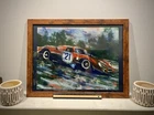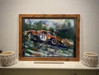 1965 Ferrari 250 LM in motion. This vehicle has been participated in Endurance race at the “24 Hours Le Mans” in 1965. Overall Dimensions approximately 20”x26”x1” painting is coming framed to a brown frame. Artwork is traditionally handmade unique and it is rare collector’s item. Can be perfect addition to fine art automotive collection.