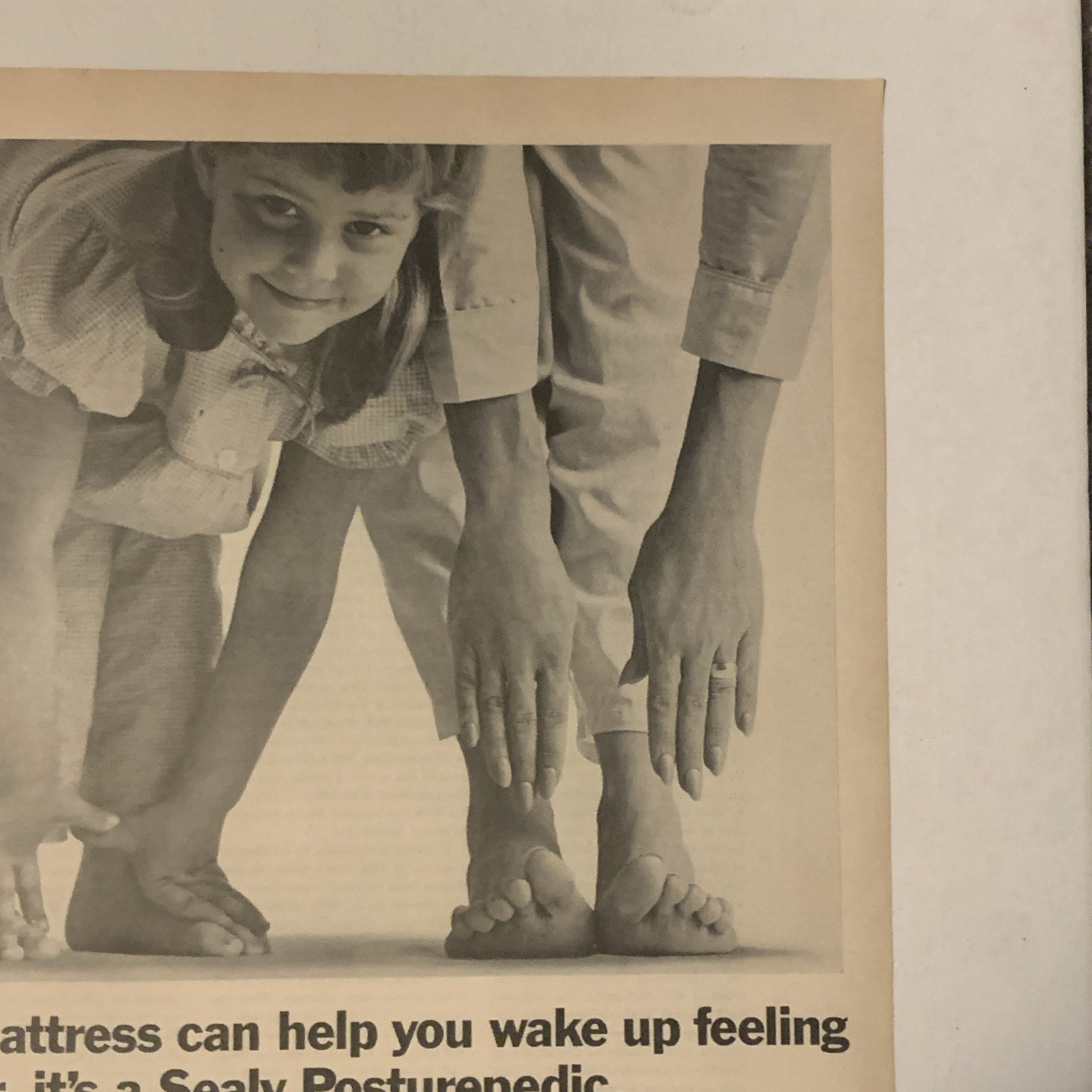 The product is a vintage 1965 Sealy Posturepedic mattress print ad that promotes the idea of waking up feeling younger with a touch of nostalgia from the 1960s. The ad features multi-color illustrations and measures approximately 10"x14". It is an original magazine print ad created in the United States, highlighting the theme of furniture and the benefits of Sealy's Posturepedic mattress for a comfortable and rejuvenating sleep experience.