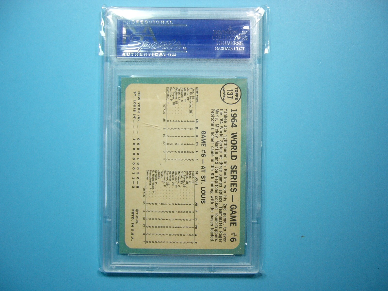 YOU ARE BIDDING ON A 1965 TOPPS MLB BASEBALL CARD #137 JIM BOUTON, ACTION CARD, NEW YORK YANKEES. WORLD SERIES GAME 6. CARD IS GRADED 8 BY PSA IN NEAR MINT/MINT CONDITION. SEE SCANS FOR FURTHER CONDITION. GREAT COLOUR & GLOSS----A SUPER SHARP, CLEAN & ATTRACTIVE VERY IMPORTANT CARD FROM THIS VINTAGE TOPPS BASEBALL CARD SET!!! THANKS FOR LOOKING AND GOOD LUCK!!! ------------------------------------------------------------------------------------------------------------------------------------------- SHIPPING WITHIN CANADA WITH TRACKING & INSURANCE IS $12.50, TO THE UNITED STATES $15.00, AND INTERNATIONALLY $55.00 (EVERYWHERE ELSE). ITEM WILL BE CAREFULLY PACKAGED SO AS NOT TO GET DAMAGED DURING SHIPPING. WE DO COMBINE SHIPPING ON MULTIPLE PURCHASES--ONLY 50 CENTS MORE PER ADDITIONAL GRADED CARD OR 20 CENTS MORE PER ADDITIONAL SINGLE UNGRADED PHOTO OR CARD. TAKE A LOOK AT OUR OTHER AUCTIONS AND SAVE ON SHIPPING!!!