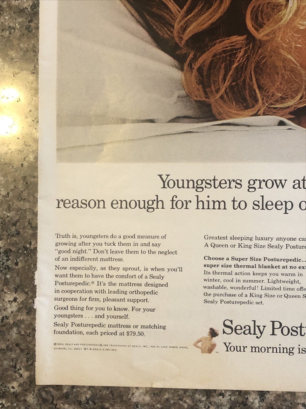 This vintage 1966 Sealy Posturepedic magazine print ad features a fun and colorful depiction of a growing youngster, highlighting the importance of a good night's sleep. The ad showcases the Sealy brand and their commitment to quality furniture, made in the United States. The collectible ad is an original piece from the 1960s and is perfect for any vintage advertising or furniture enthusiasts. The multi-color design and furniture theme make it a great addition to any household decor. Don't miss your chance to own this unique piece of history. Original approximate 10”x14” vintage magazine print ad.