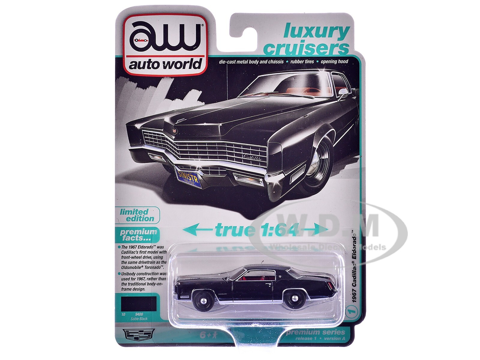 SAVE WHEN BUYING MORE!!! Buy as many items as you wish and we will ship them for one low shipping cost to 48 continental U.S. states physical addresses. Example: Shipping cost for most 1/24 scale items is $10, for 1/18 scale items is $12. If you use Add to cart button and purchase 5 items in 1/24 scale and 5 items in 1/18 scale, your shipping cost will be only $12 for 10 items. In order to request combined shipping for signed in desktop users: Please use Add to cart button for desired items, click Go to cart button and press Request total from us before paying and we will send combined shipping invoice shortly. If checking out as a Guest or using a mobile version, please use Add to cart button then click Go to cart button , press Go to checkout button, request extra shipping refund in Message to seller section and finalize payment by pressing Confirm and pay button. We will refund extra shipping cost shortly. DESCRIPTION: Brand new 1/64 scale diecast car model of 1967 Cadillac Eldorado Sable Black with Red Interior "Luxury Cruisers" Series die cast model car by Auto World. Brand new box. Real rubber tires. Has opening hood. True-to-scale detail. Detailed interior, exterior. Comes in a blister pack. Officially licensed product. Die-cast metal body and chassis. Manufacturer's original unopened packaging. Dimensions approximately L-3.375 inches long. PAYMENT INSTRUCTIONS: We gladly accept paypal. Tracking info is free upon request. SHIPPING INFO: We do combine shipping cost for two or more items purchased. Please check shipping and payment section. In order to receive combined invoice for multiple purchases, please purchase items and let us know when you are done shopping, so we can send you one combined invoice. We can only combine shipping cost if items paid in one transaction. Dear Valued Customer! We appreciate your business. BUY WITH CONFIDENCE Fast Order Fulfillment 99% of orders are shipped within 24 hours or sooner. Simple Return Policy Thirty days simple returns. More than 10 Years of Experience Family owned and operated, we’ve had the experience of selling online for more than 10 years. Satisfaction Guaranteed! Our feedback says it all. And now, we hope to have the chance to prove we are the best to you! Competitive Pricing and Unrivaled Selection We are the number one direct distributor of diecast model cars in the USA, so we are able to provide very competitive pricing. Our stock selection is unrivaled with over 4,500 different items. Quality Shipping & Handling We package all our orders with care using bubble wrap to protect models from damage in transit. Each model that has a fragile window box is covered with carton protection. Excellent Customer Service Our customer service is second to none with thousands of returning, satisfied customers from all over the world.