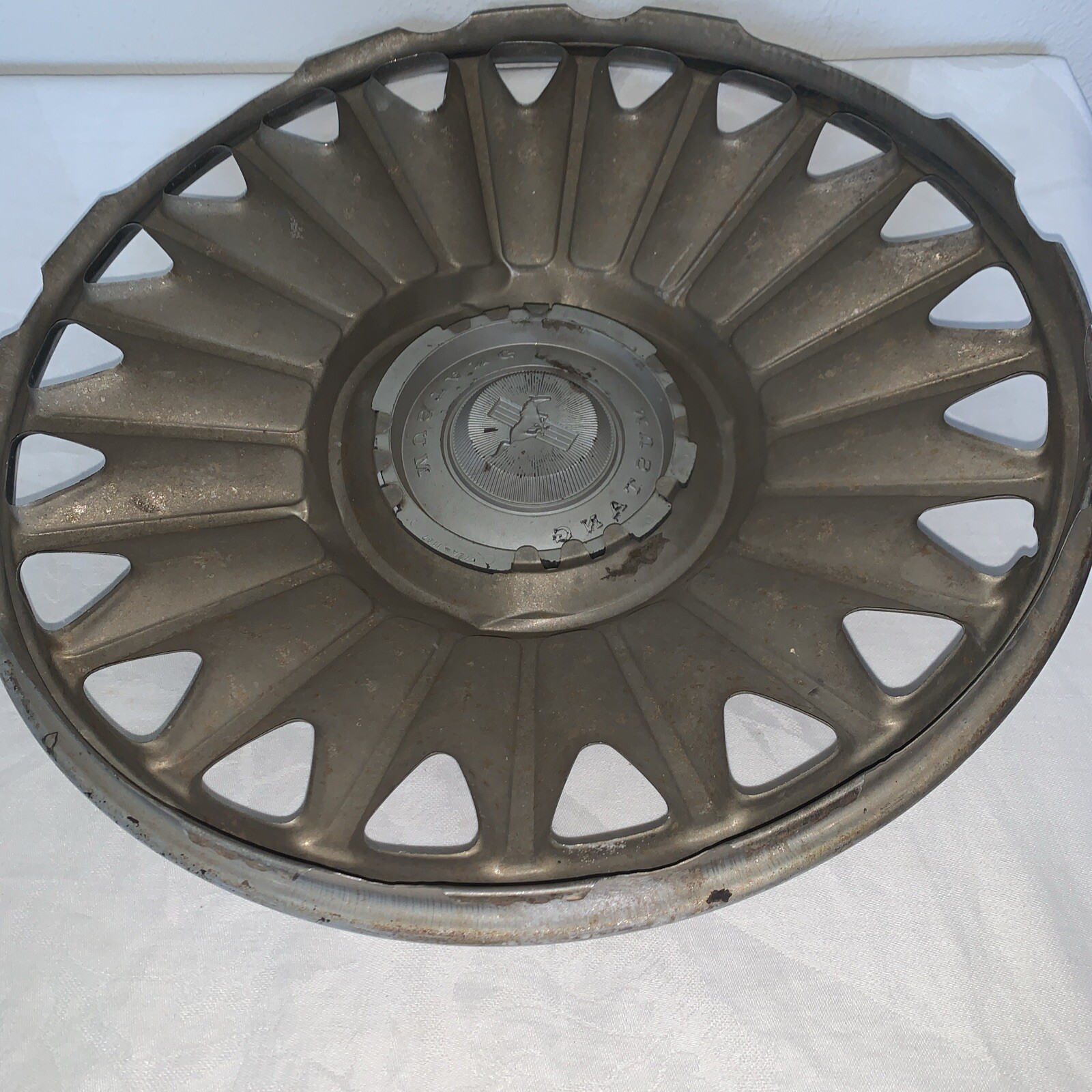 This vintage 1967 Mustang hub cap is the perfect addition to your vintage Ford Mustang. Made with high-quality materials, this 21-rib cap is designed to fit 14-inch wheels and comes in a sleek silver color. Featuring the iconic Mustang logo, this hub cap is a great way to add some style to your ride. Whether you're a collector or just looking for a unique accessory, this vintage hub cap is sure to impress. Don't miss out on the opportunity to add this classic piece to your collection. Dented around the 6" ring - I think a restorer could fix it.
