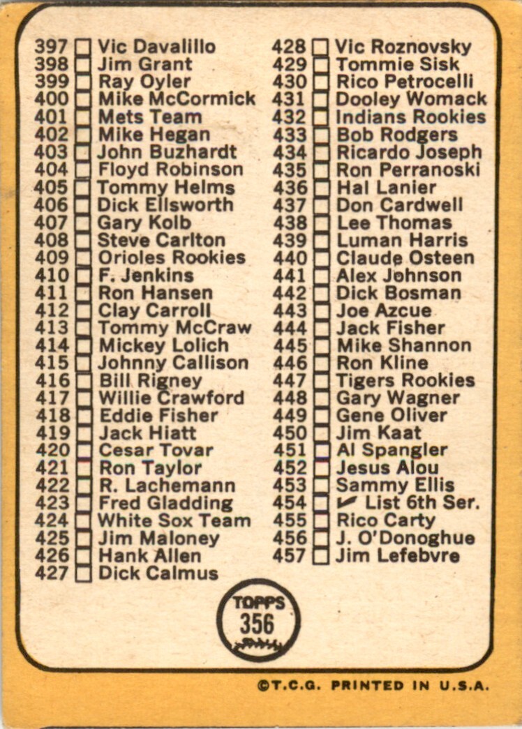 1968 Topps #356 5th Series Checklist Ken Holtzman Chicago Cubs VG-EX