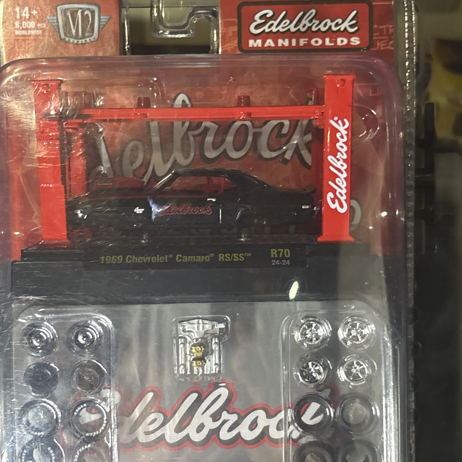 The product is a 1969 Chevrolet Camaro SS model kit by M2 Machines, featuring a 1:64 scale and diecast material. It comes in a black color with EDELBROCK theme, packaged in an unopened box. This limited edition kit is recommended for ages 14 and up, perfect for boys and girls who enjoy building toy cars. With its detailed design and high-quality construction, this Chevrolet Camaro SS model kit is sure to provide hours of fun for hobbyists of all ages.
