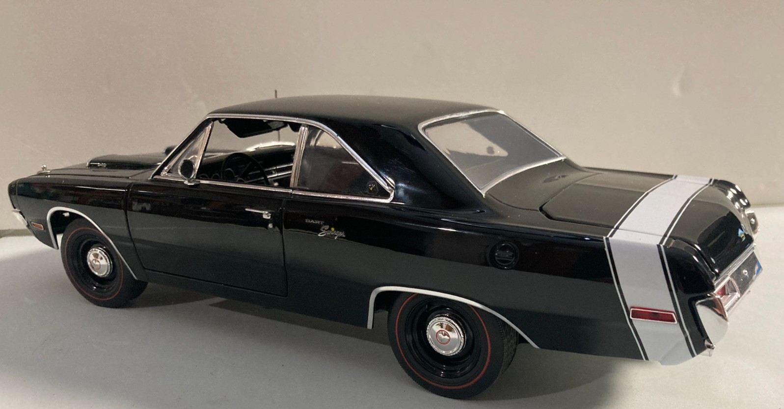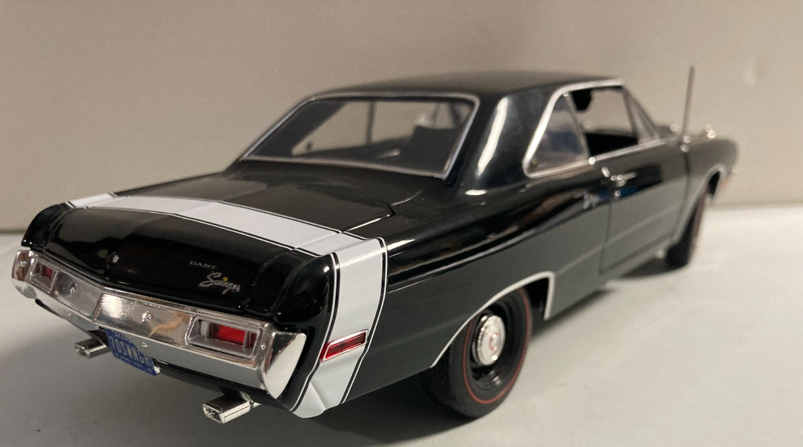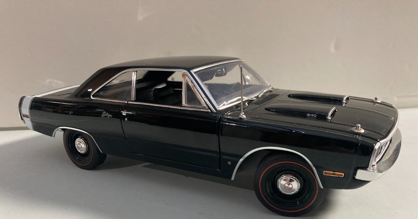 The 1969 Dodge Dart Swinger 340 with a vinyl top is a 1/18 scale diecast car by Acme, released in 2021. This model features a black color and is designed to look like the classic Dodge Dart from 1969. Perfect for collectors and enthusiasts aged 13 and up, this detailed replica of the iconic car is a must-have addition to any diecast car collection. This was a display in a shop so it has a bit of dust. Please review the pictures and if you have questions please send a message before buying. It is a really nice die cast for display. Comes with hood pins attached, No Box