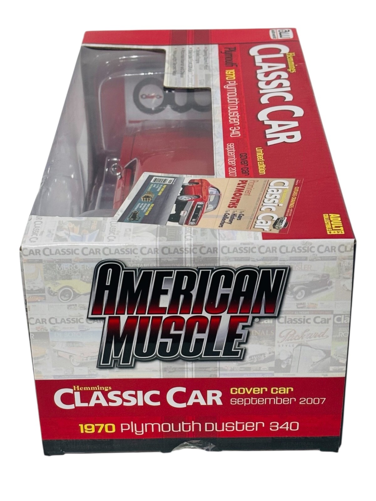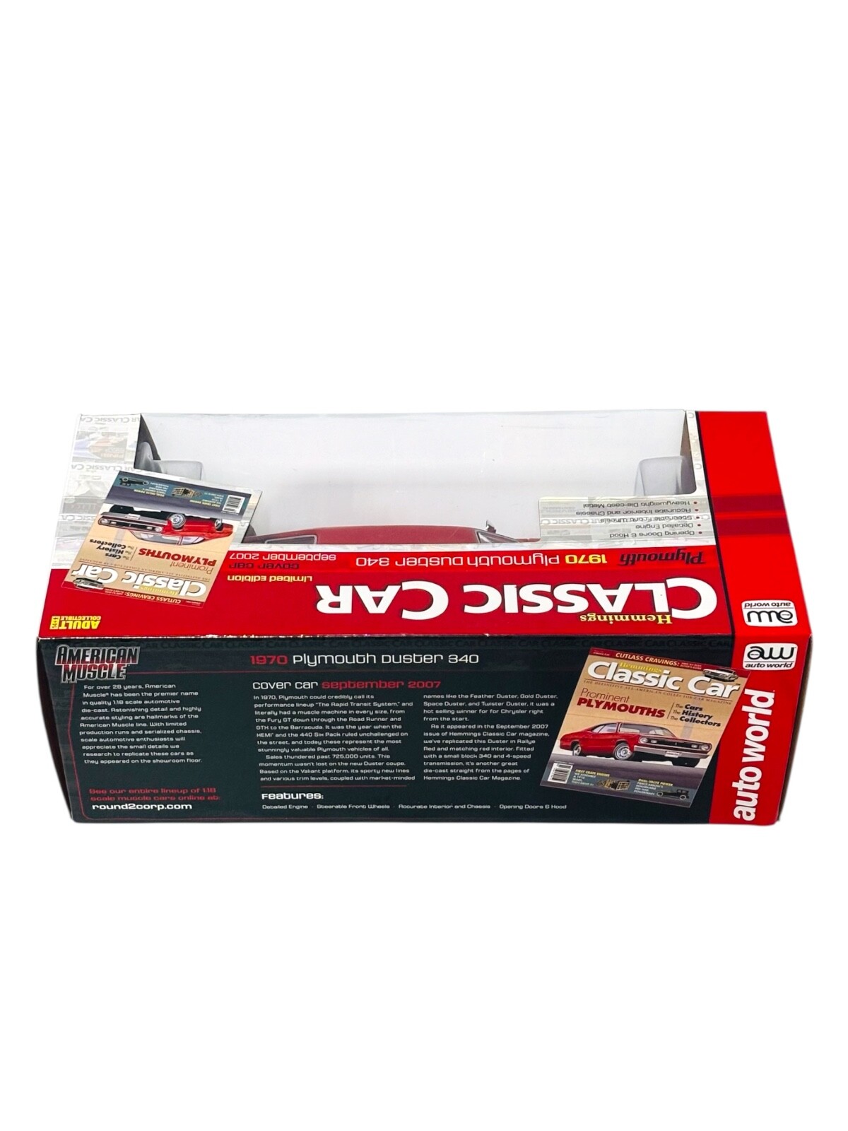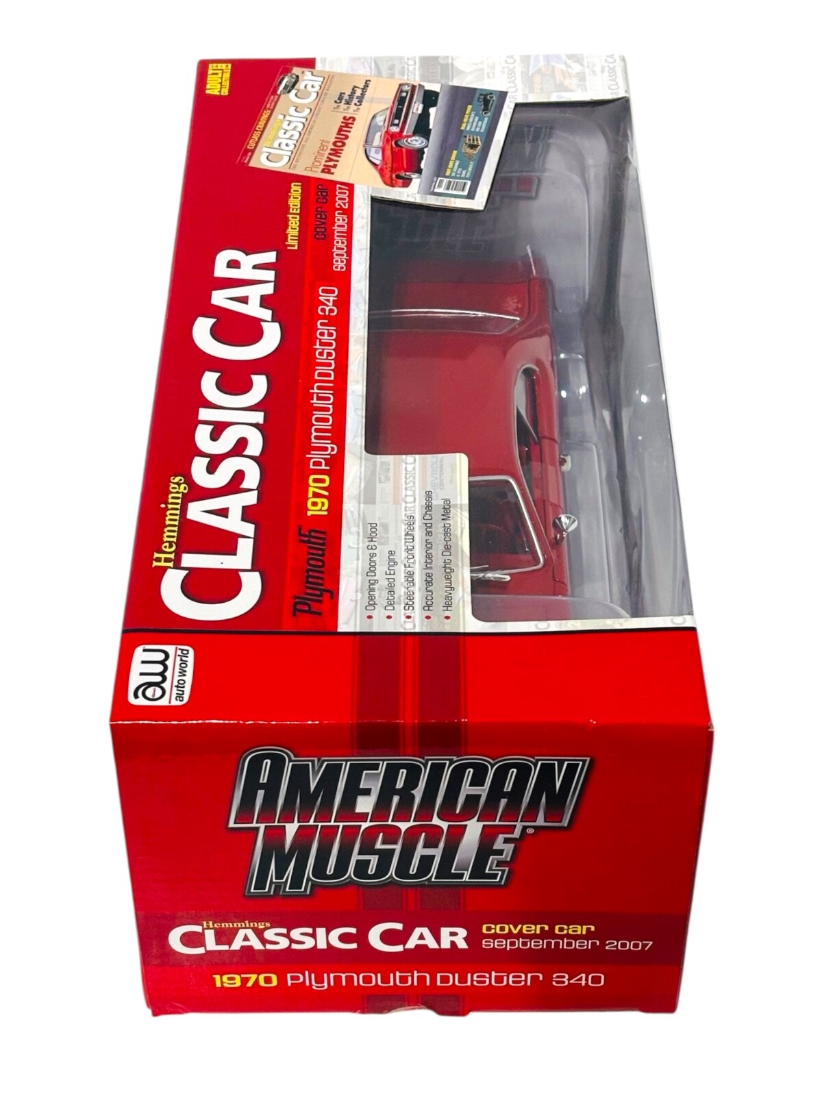 Auto World American Muscle - Hemmings Classic Cars | 1970 Plymouth Duster 340 Hardtop. 1:18 scale diecast collectible model car. This Plymouth is a 10.75"L x 4"W x 3"H diecast metal car with steerable front wheels, openable hood and doors. Featuring detailed engine, accurate interior, and chassis. This 1970 Plymouth Duster is manufactured by Auto World. Individually packed in a window box. Box size: 13.25"L x 6.1"W x 5"H. AMM1205 is in Rallye Red color. Limited Edition.