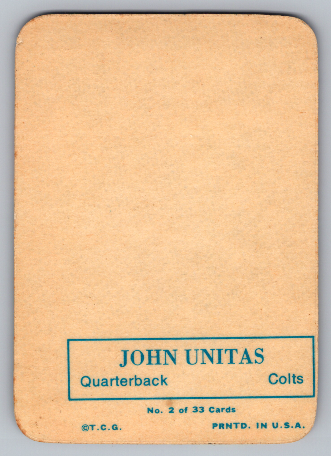 Set:1970 Topps Glossy InsertsYear Manufactured:1970Sport:FootballSeason:1970Card Number:#2Vintage:YesPlayer/Athlete:Johnny UnitasType:Sports Trading CardOriginal/Licensed Reprint:OriginalManufacturer:ToppsLeague:National Football League (NFL)Team:Baltimore ColtsCountry/Region of Manufacture:United States