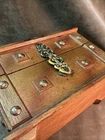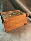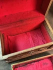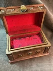 This measures 5 1/2 inches high 8 1/2 inches long and is 4 1/2 inches across front to back. The outside isn’t overall good condition on the inside. The tray does need to have the fabric replaced. It does that look rather bad, but no other real issues, see photos.