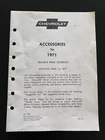 Up for your consideration is a 1971 Chevrolet Accessories Dealer's Price Schedule effective April 15, 1971. Available for all Passenger Car Models. Rare piece of Chevrolet literature. 14 pages. Measures 4 1/2" x 8 1/2". Impala Caprice Chevelle SS Nova Monte Carlo Camaro RS Z/28 Corvette Booklet is in Good Condition! Please view my photos for further review. No Shipping Outside of the USA!