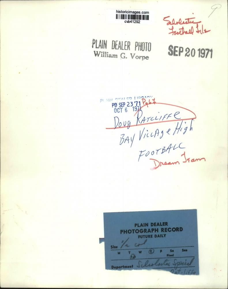 ebay template Note: Please study the images carefully to determine the condition of this vintage photograph, as it may not be in perfect condition. It may contain wrinkles, cracks, and possibly even tears due to its age and how it was handled before it got to us. A scanner may interpret colors and contrast differently than human eyes will, so it is possible that the actual photograph may be slightly darker or lighter in person. This vintage photograph is offered for sale as a collectible item and conveys no transfer of copyright. 1971 Press Photo Dou Ratcliffe, bay Village High-Dream Team Football - cvb41292 This is an original press photo. Dou Ratcliffe, bay Village High-Dream Team FootballPhoto measures 8 x 10.25inches. Photo is dated 9-20-1971. PHOTO FRONT PHOTO BACK Historic Images Part Number: cvb41292 FAQs Q: Can I just download a digital version instead? A: No, we sell only vintage originals and do not make or distribute any copies, including digital ones. Q: Do you combine shipping and invoices? A: Multiple photos won on the same seller ID combine automatically through the eBay checkout process. If you encounter problems with this, send us a message via eBay messaging and we will send you an invoice. Due to eBay limitations, we cannot combine items won on our different seller IDs for a single shipping charge. Q: How quickly do you ship the items once paid? A: We ship within one business day after your payment clears. If you do not receive an "order shipped" email from us by the close of the second business day from submitting payment, please e-mail us via eBay messaging. Q: How do you make sure my photograph arrives safely? A: We package each order between two cross-corrugated pieces of cardboard to ensure that the package is as difficult to bend as possible. We then wrap each order in a plastic sheet to help protect against moisture. We want you to rest assured that we take every precaution to ensure that the photograph you receive will be in the same condition in your care as it was in ours. Q: Will the "Historic Images" watermark be on my photo when I receive it? A: No. This is a digital watermark we use to protect our images. It is not printed on the photo. Q: What are your office hours? A: eBay for us is a business, and a very fun one to be in! We are open M-F 9 to 5 (CST). Therefore, we do not return e-mails and phone calls over the weekend. We observe the following holidays: New Years Day, Memorial Day, Fourth of July, Labor Day, Thanksgiving and the day after Thanksgiving, Christmas Eve and Christmas Day. Q: Where did all these vintage photos come from? A: These original vintage photographs are from various news service and newspaper photo archives from locations around the country including: Boston, Detroit, Tampa, Chicago, Denver, Seattle, New Orleans, Milwaukee, Portland, Spokane, and more. We do not copy or reproduce any photographs -- every item is a unique vintage piece that was housed in a news archive. Q: Can I use this photograph in my book/blog/website? A: The short answer is no. There is no transfer of copyright for republication or reproduction with these photographs when you purchase them, and only photographs taken before 1923 are currently automatically in the public domain. Permission from the copyright holder, which usually can be identified from the back of each photo, must be sought to republish or reproduce the image for any purpose. Q: Do you relist items (in case I miss an auction ending)? A: Auction items that receive no bids are relisted in our store (historicimages-store on eBay) as a fixed-price item and at a higher price than the starting auction price. Q: Do you leave feedback? A: Yes, we always leave feedback for buyers. Our software monitors when our buyers leave us feedback, then notifies us that we can leave feedback for the buyer. Rest assured, if you leave feedback, we will do the same! Check out our family of eBay IDs: historicimages01 Sports Photos historicimages02 Entertainment Photos historicimages03 Americana Photos historicimages04 International & War Photos historicimages05 Transportation Photos historicimages06 Photos of All Subjects historicimages07 Entertainment Photos historicimages08 Newsworthy Photos historicimages09 Entertainment Photos historicimages10 Sports Photos historicimages-store Our largest fixed-price selection historicimages-gallery Hand-picked photos Saturday night auctions About Us Historic Images was formed in September 2009, with a handful of scanners working out of a basement to digitize newspaper photo archives. We have since moved out of the basement, and we can now archive thousands of photos per day. Our company has worked with magazines and newspapers from Detroit, Boston, Denver, Seattle, Tampa, Chicago, and New Orleans, just to name a few. We are constantly adding to our inventory, and have assembled an archive of millions of photos to date. As our company evolved, we began our eBay business, which brings thousands of fresh auctions per week to the world's largest online auction marketplace. Our custom software systems and team of great employees allow us to efficiently scan and sell large photo archives online. At the very core of our company's DNA is a strong commitment to customer satisfaction and strict integrity for our product. Our promise to you is that we will do everything in our power to provide you a great buying experience. Copyright 2009 - Present, Historic Images, Inc. Sell Smarter with Kyozou. Inventory and Ecommerce Management