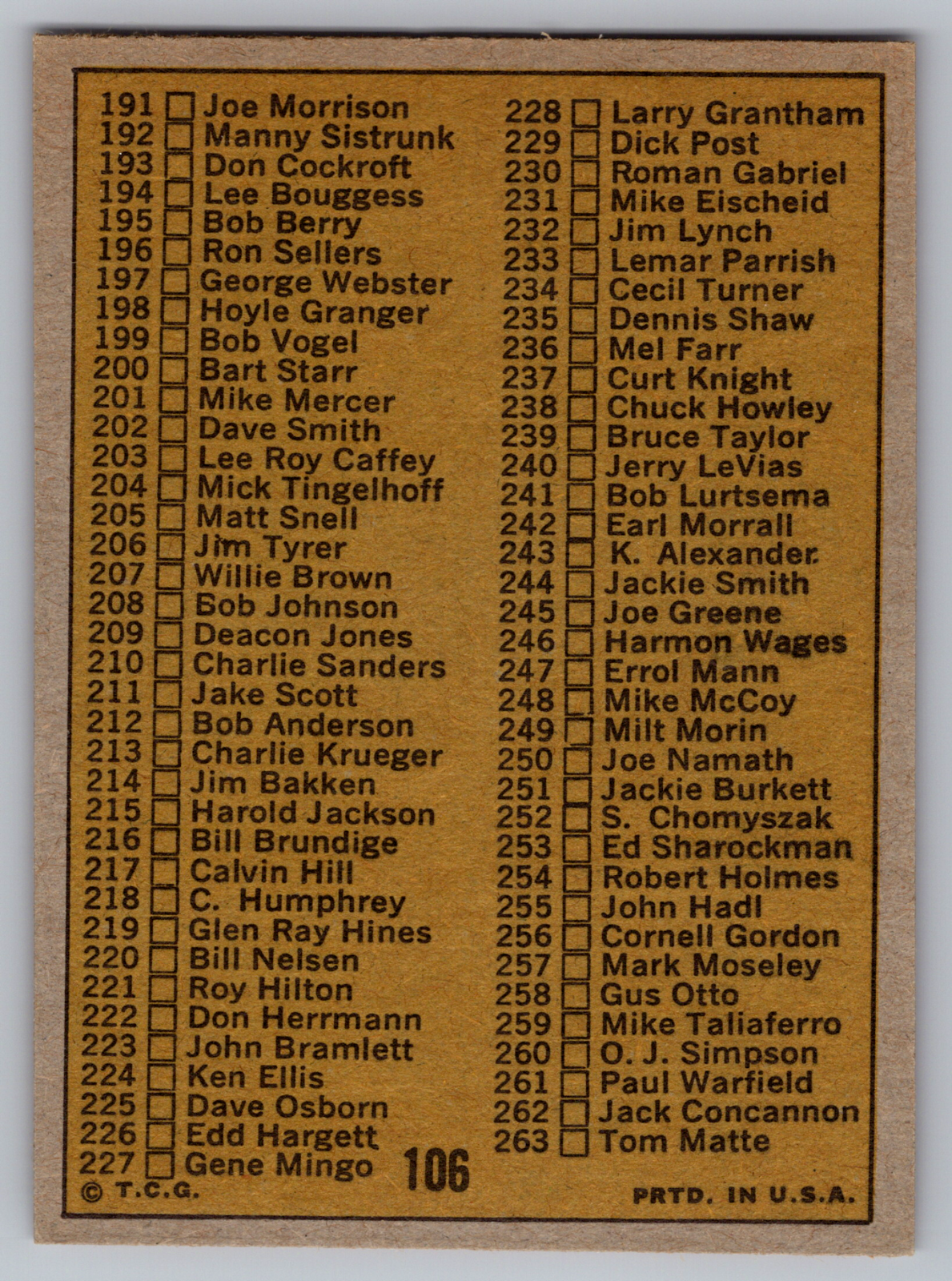 Vintage:YesSet:1971 ToppsCountry/Region of Manufacture:United StatesCard Number:#106Manufacturer:ToppsLeague:National Football League (NFL)Sport:FootballOriginal/Licensed Reprint:OriginalType:Sports Trading CardSeason:1971Features:Checklist 2nd Series - UnmarkedYear Manufactured:1971
