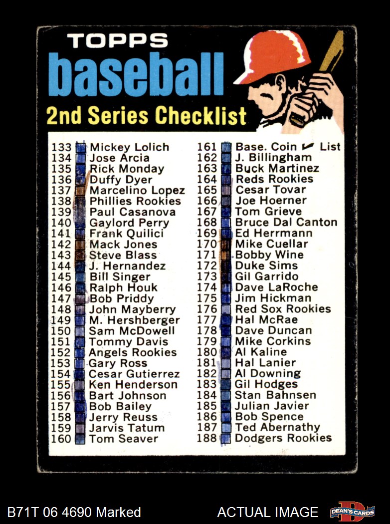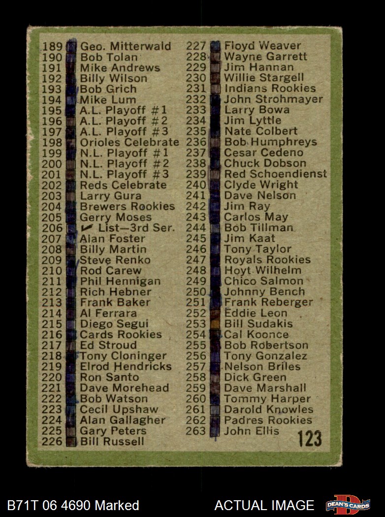 1971 Topps #123 Checklist 2 The Card Number in Lower Right on Back VARIATION 1 - POOR If the scan in the listing says ACTUAL IMAGE, you will receive the card pictured. For cards issued after 1983, we will often use representative images and you will not receive the exact card pictured. Shipping Policy You only pay shipping on the first item. If you order multiple items on the same order, you will only be charged once for shipping. We do not combine shipping on multiple orders. To avoid multiple shipping charges we recommend using eBay's "Add to Cart" feature to check out multiple items in one transaction, or please request and allow for us to send an invoice to reflect the combined shipping charges. Canadian customers - We send all of our Canadian/International packages with tracking and cannot make any exceptions to this policy. Negotiating Prices All prices are final and we do not negotiate. This policy is to ensure that everyone knows that they are getting our best possible price. So please do not ask us to negotiate on price. Return Policy Dean's Cards has a 100% Money Back Satisfaction Guarantee on all purchases, as long as the product is returned within 30 days of receiving the product. Card Grading Each card is first reviewed by a member of our team, in order to detect any flaws that may not be visible on a scan, such as wrinkles, creases, print spots, or light stains. The vast majority of our vintage cards are professionally graded by the Dean's Cards Grading Software and include a 100% satisfaction guarantee. Our grading is on par with PSA standards when it comes to corners, centering and flaws - and tends to grade a bit tougher than PSA, on cards with a tilted image or rough edges. This grading software was developed to provide far better grading and consistency than can be achieved using the human eye. Determining the card's grade The sharpness of the corners and the degree to which a card was cut off-center determines the maximum possible grade that the card can receive. The card's grade is further reduced by any flaws or blemishes that it may have. Each card is evaluated on the following characteristics and assigned a score. Corners - Each corner of a card is individually analyzed, and then assigned a score on how square, sharp, and flawless it appears. Centering - The borders are measured, at multiple points along the edge, to determine the horizontal and vertical centering and tilt. Defects - The card is examined for imperfections, such as: size, print flaws, dings, stains, creases, or other wear which could lower its grade. Bonus for Perfect Centering - A vintage card, with near perfect centering, is given a one-half grade bonus. So when you buy one of our cards with a half-grade (e.g. 3.5 or 6.5) it will appear perfectly centered, both vertically and horizontally. Grading Criteria Worst Corner - A card can grade only as high as the worst corner will allow. Average Corner Tilt - The difference in width of a card border near the top, compared to the bottom. OCT - The sum of how far a card is Off-Center, plus its Tilt. Minimum Centering Requirements Eye Appeal - The combination of a card's centering, corners and tilt. Well-Centered - Cards that appear perfectly centered receive a bonus of one-half grade. Flaws, defects and other imperfections - can lower a card's grade. Card Backs - the above criteria is also considered, for the back of the cards, but does not inflict as severe of a penalty to its grade. Packaging Once scanned, the cards are placed in "soft" sleeves, which have an open top for easy removal. The Dean's Cards label is placed on the top back of the card sleeve. Every card you buy features a QR Code that you can scan to see your ACTUAL CARD and its grading statistics. Please note that when images are enlarged there may be instances of vertical lines running through the scans. This was caused by a "dust speck" on the scanner and can be verified by the vertical lines running into the black margins on the top and bottom of the image. About Dean and Dean's Cards Dean's Cards Makes Card Collecting - Fast, Easy And Fun. Dean's Cards was founded in 2002 and has become the leading online seller of vintage sports cards and non-sports cards. Our inventory has grown to more than a million vintage cards and we have a staff of 15-20 employees and a 8500 sq. ft. office space in Cincinnati, Ohio.