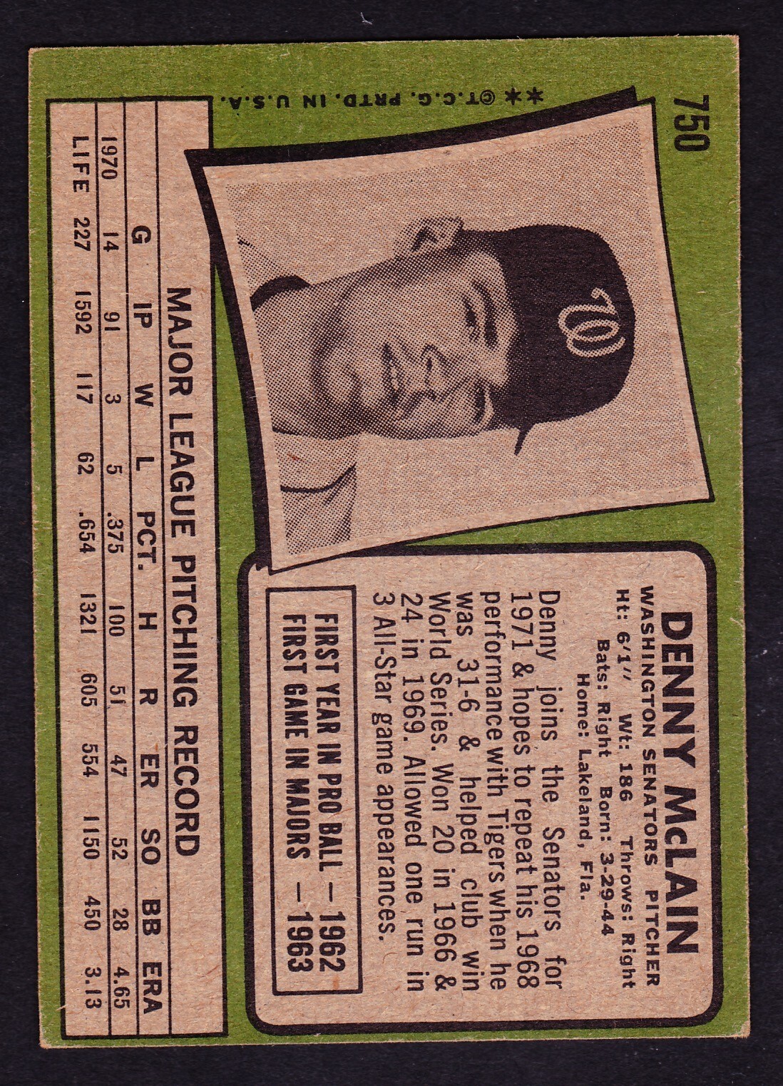 This 1971 Topps Denny McLain card is in fantastic condition—no creases, sharp corners, and vibrant colors. Free shipping is a great bonus! A must-have for vintage baseball card collectors. Inventory #241127-2 makes it easy to find. Very happy with this purchase!