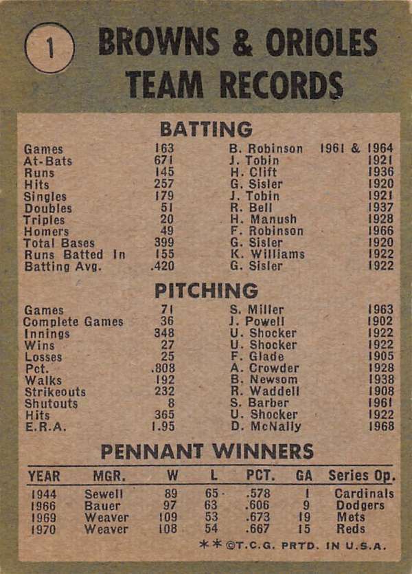 League:Major League Baseball (MLB)Team:Baltimore OriolesSeries:Toppsbrand:ToppsCard Number:1Parallel/Variety:[Base]Season:1971Set:1971 ToppsAdditional Description:Baltimore Orioles Team (World Champions)Sport:BaseballManufacturer:ToppsFeatures:Base Set